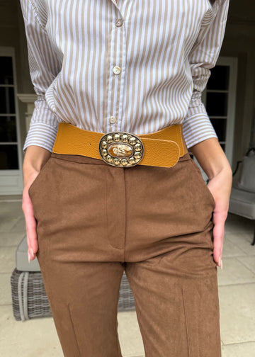 Add a dash of charm to any outfit with the Virginia Oval Stone Buckle Belt. Crafted from stretchy vegan leather in a warm camel hue, it’s as comfortable as it is cute. The unique oval stone buckle brings just the right amount of playful flair to your look!