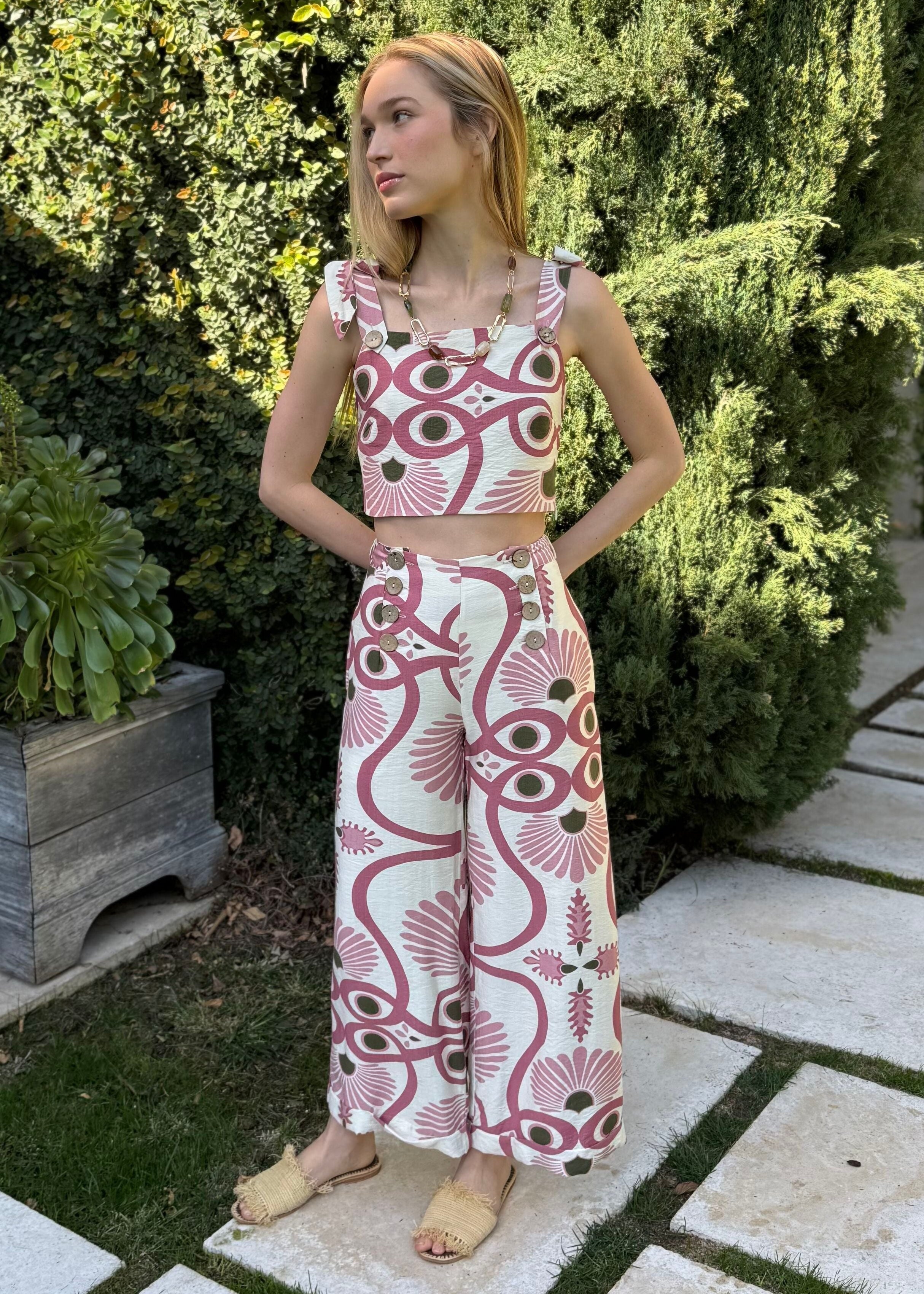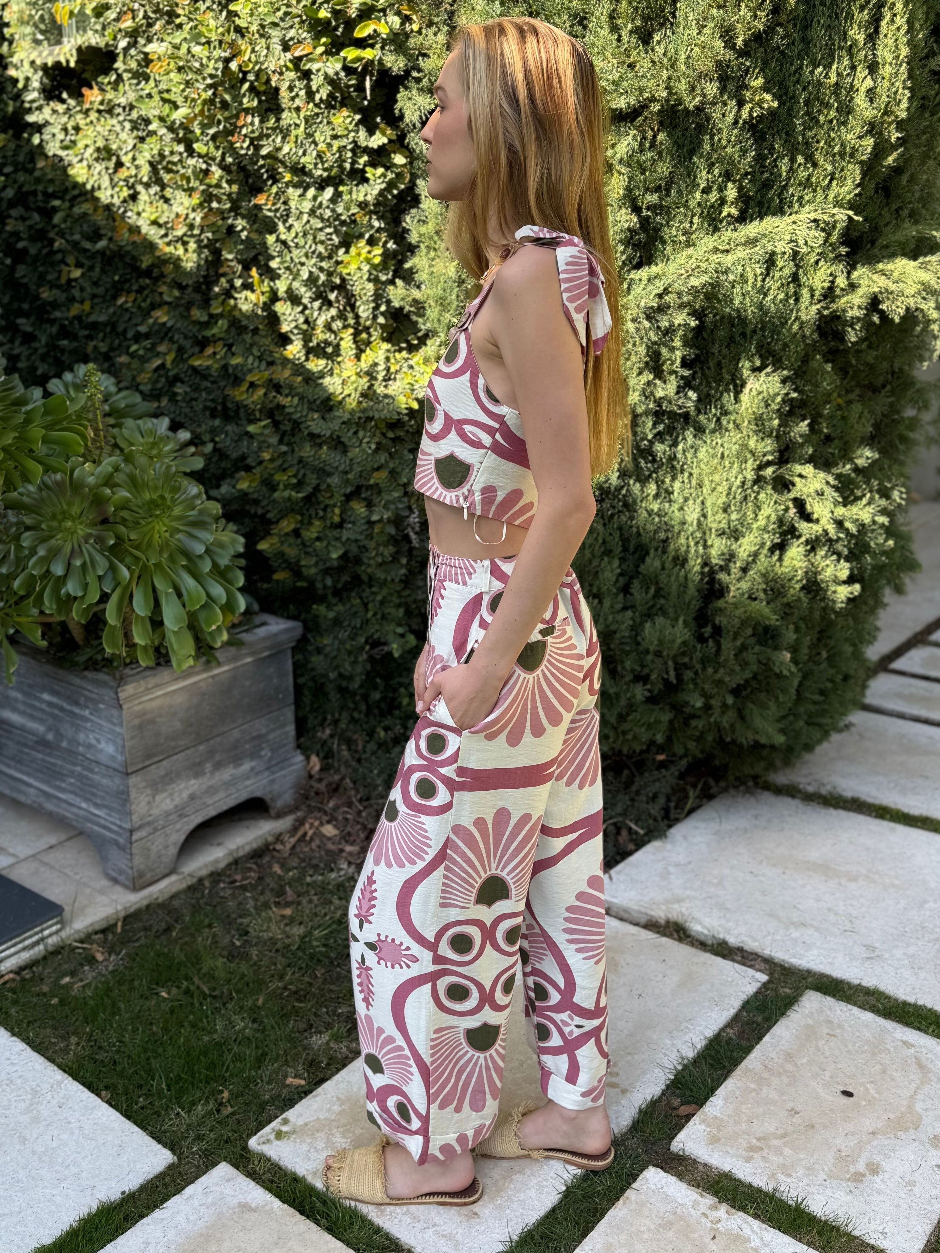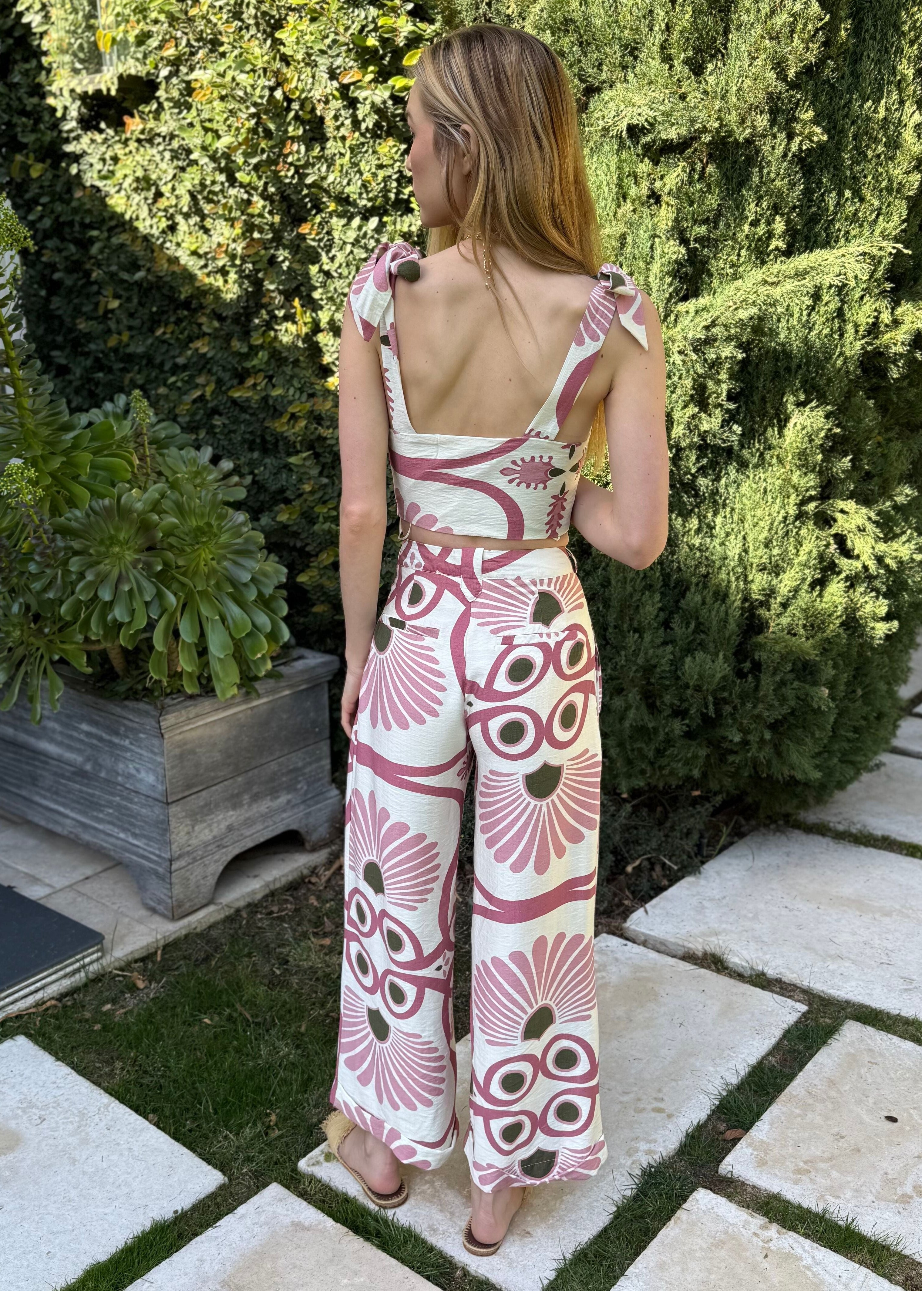 Get ready to make waves in this playful two-piece set. The cropped tie shoulder top brings unexpected flair while the wide-leg pants keep things comfy and cool. Whether you're hitting the town or just vibing, this set delivers personality with zero effort.