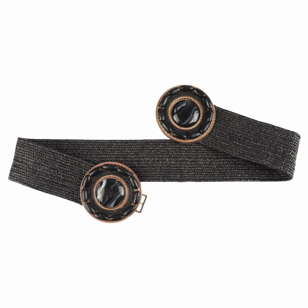 Elevate your ensemble with this elegant woven belt featuring a distinctive double circular buckle and an elasticized fit for comfort and style. Perfectly crafted to enhance tailored looks with a refined touch.