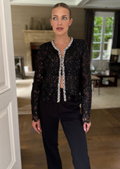 Elevate your wardrobe with the Ivana Rhinestone and Sequin Adorned Lace Cardigan Top. Expertly crafted with delicate lace and embellished with sparkling rhinestones and sequins, this cardigan offers a refined blend of elegance and subtle glamour, perfect for sophisticated layering on special occasions.