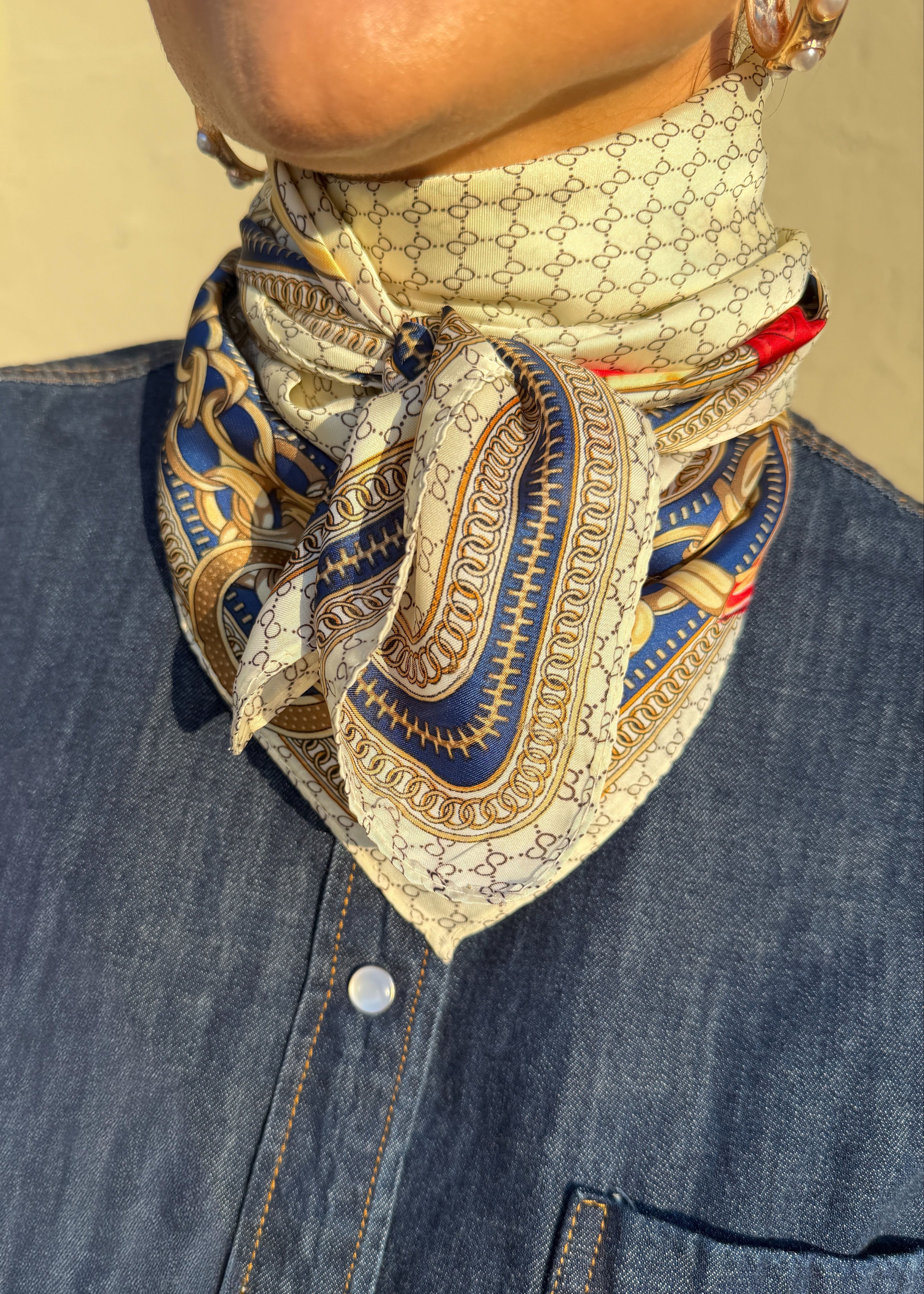 Elevate your accessory collection with this luxurious silky bandana square scarf, featuring an intricate multi-pattern design. Wear as a headscarf, or tied to your bag for versatile, refined, and effortlessly chic styling.