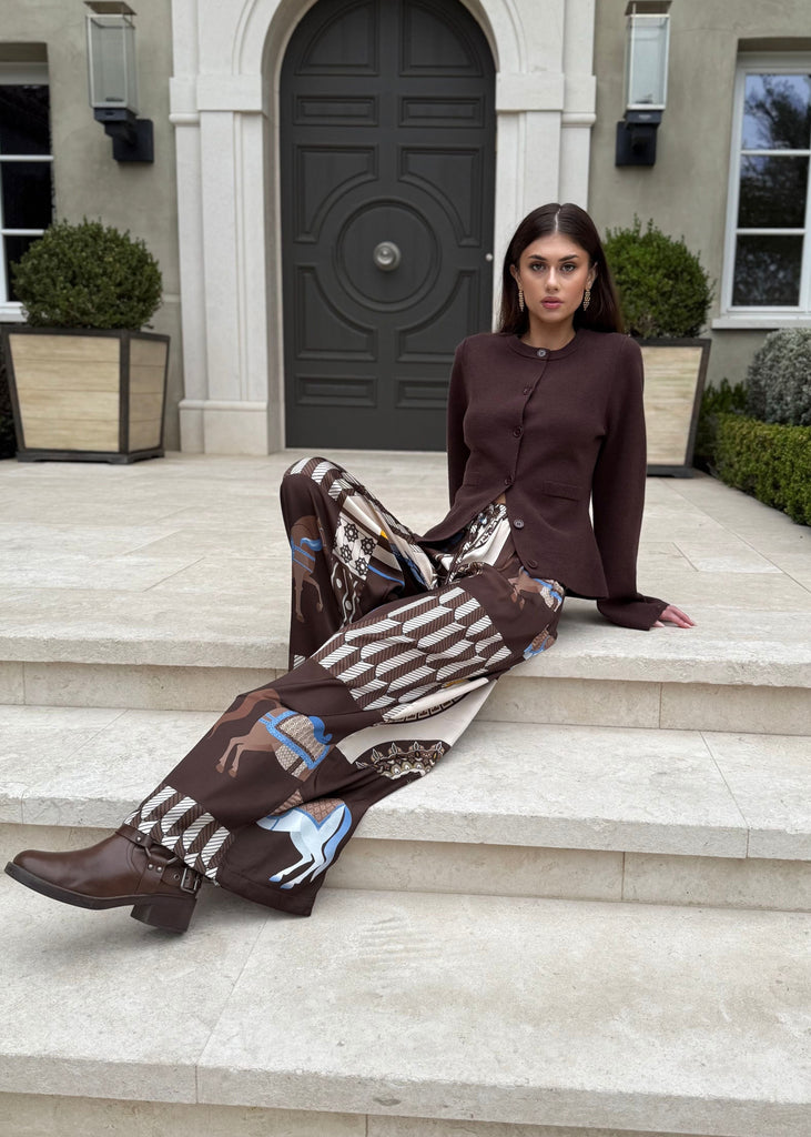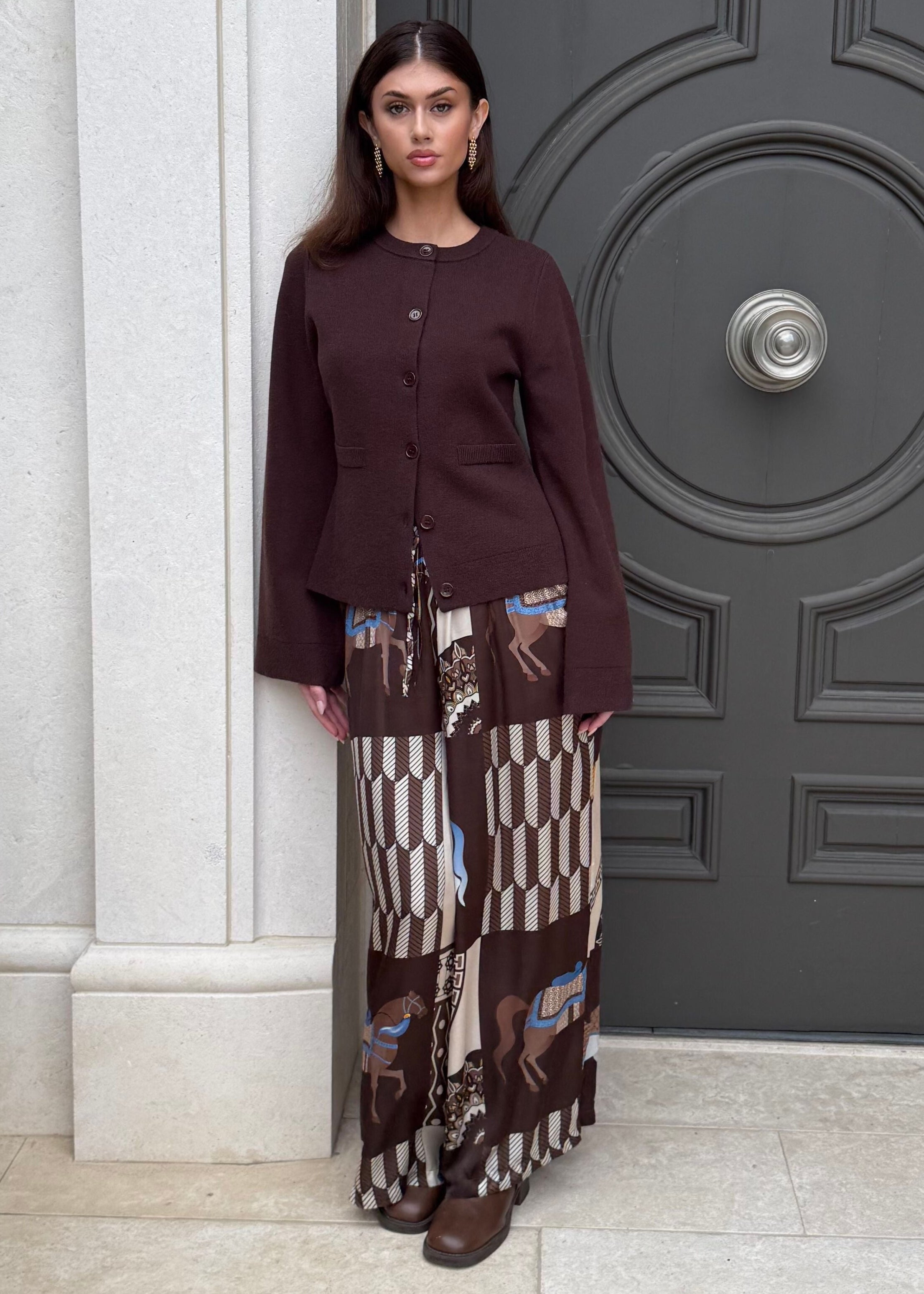 This Maeve cardigan features long flare sleeves and a button-down front, crafted from a soft knit in a rich chocolate brown. Its tailored silhouette combines classic elegance with a modern twist, making it a versatile layering piece for refined, everyday wear.