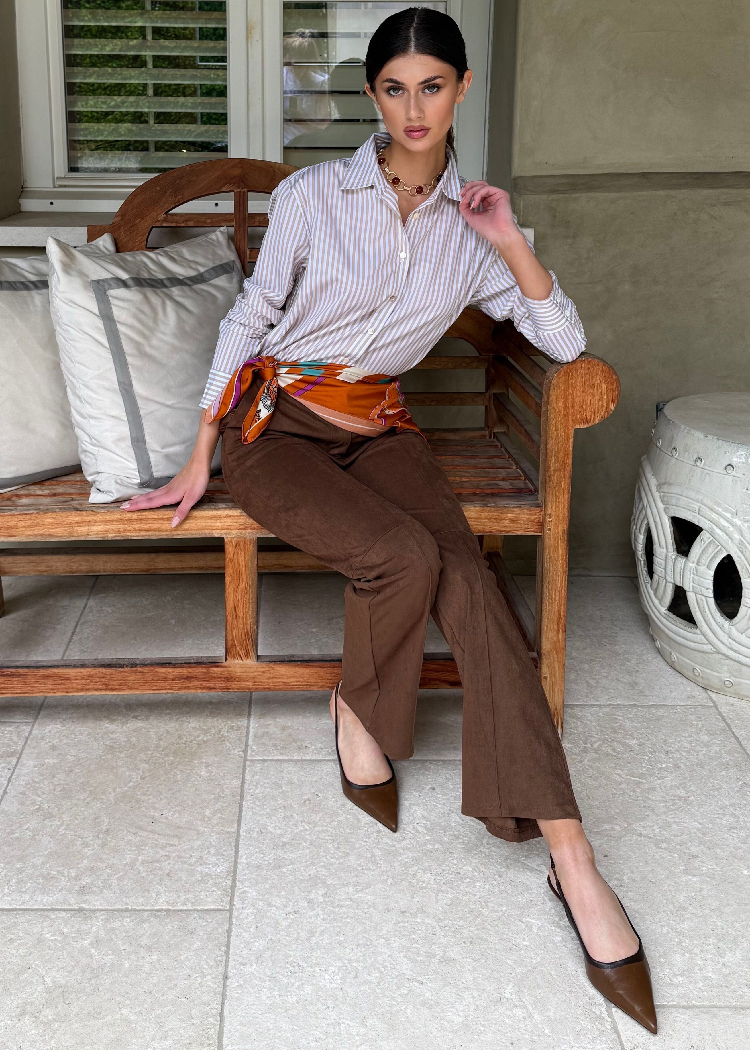 Step out in style with the Nora Vegan Suede Flare Pants in Brown. These fun flared pants bring a soft, suede look without any animal products—perfect for turning heads and feeling comfy all day. Playful, chic, and effortlessly cool, they’re your new go-to for standout outfits!