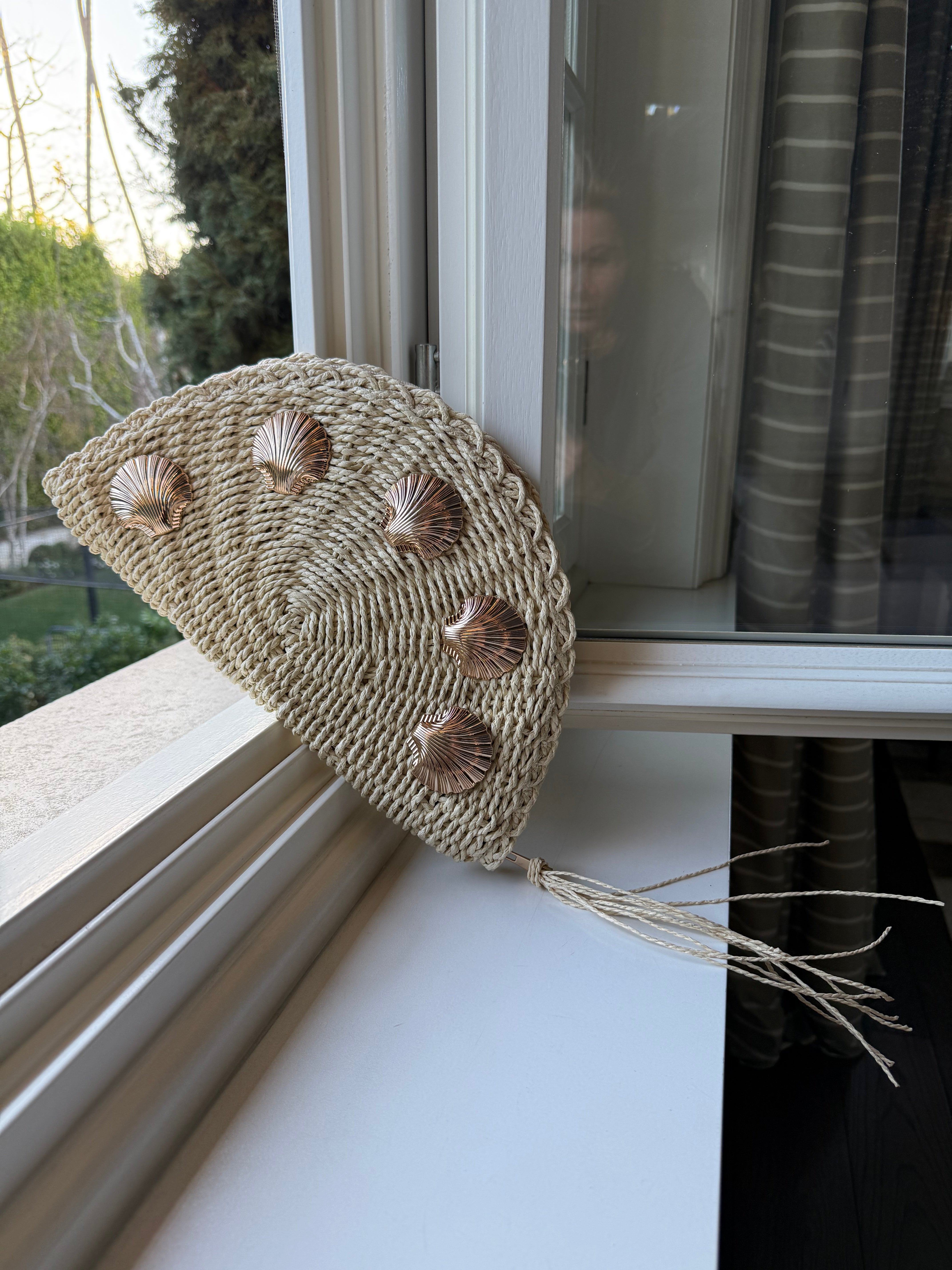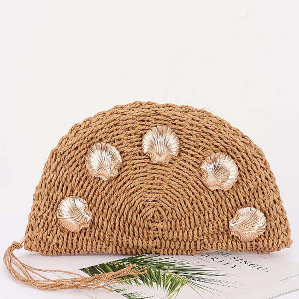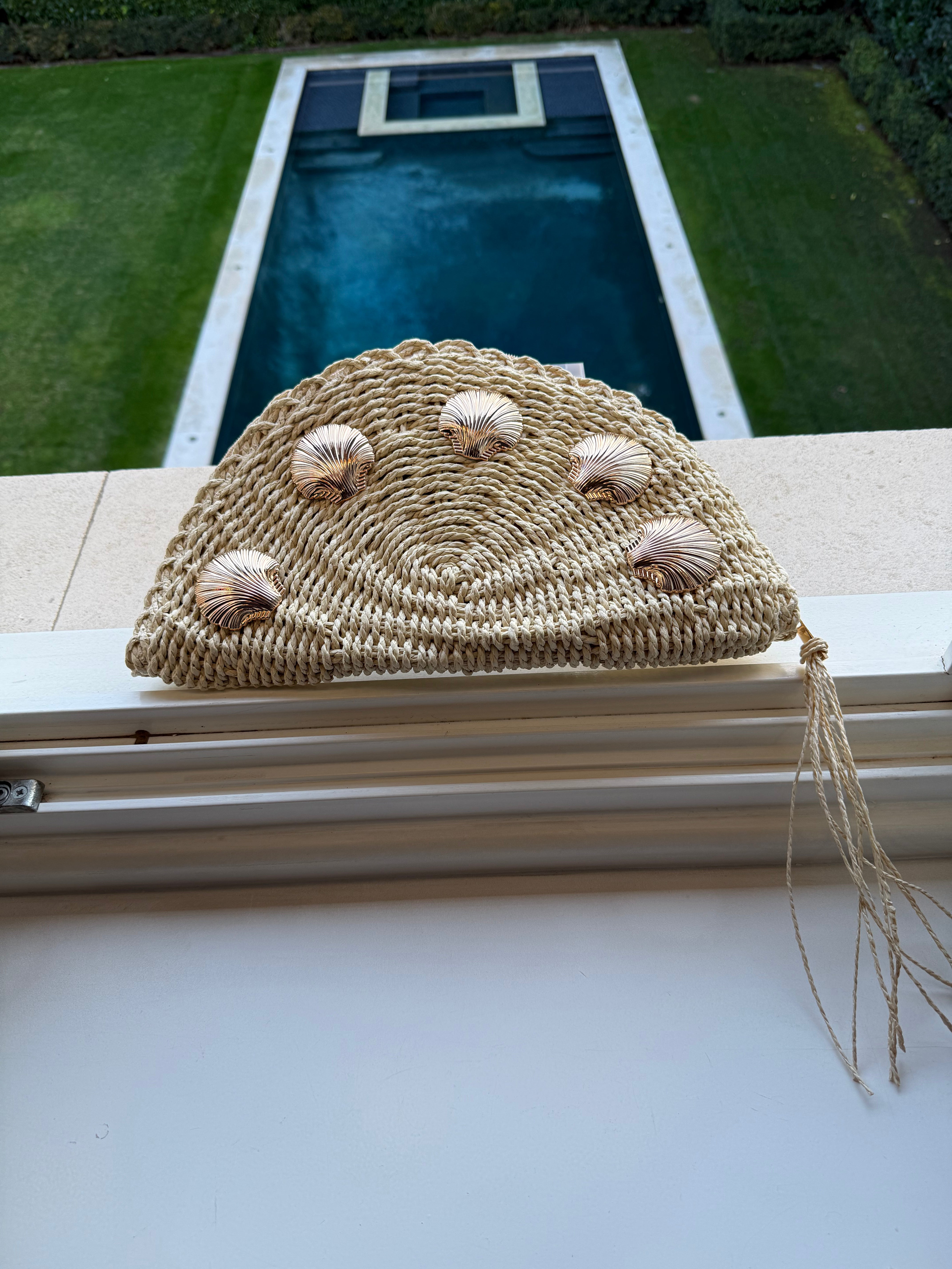 Helen Straw Half-Moon Clutch with Shell Embellishments