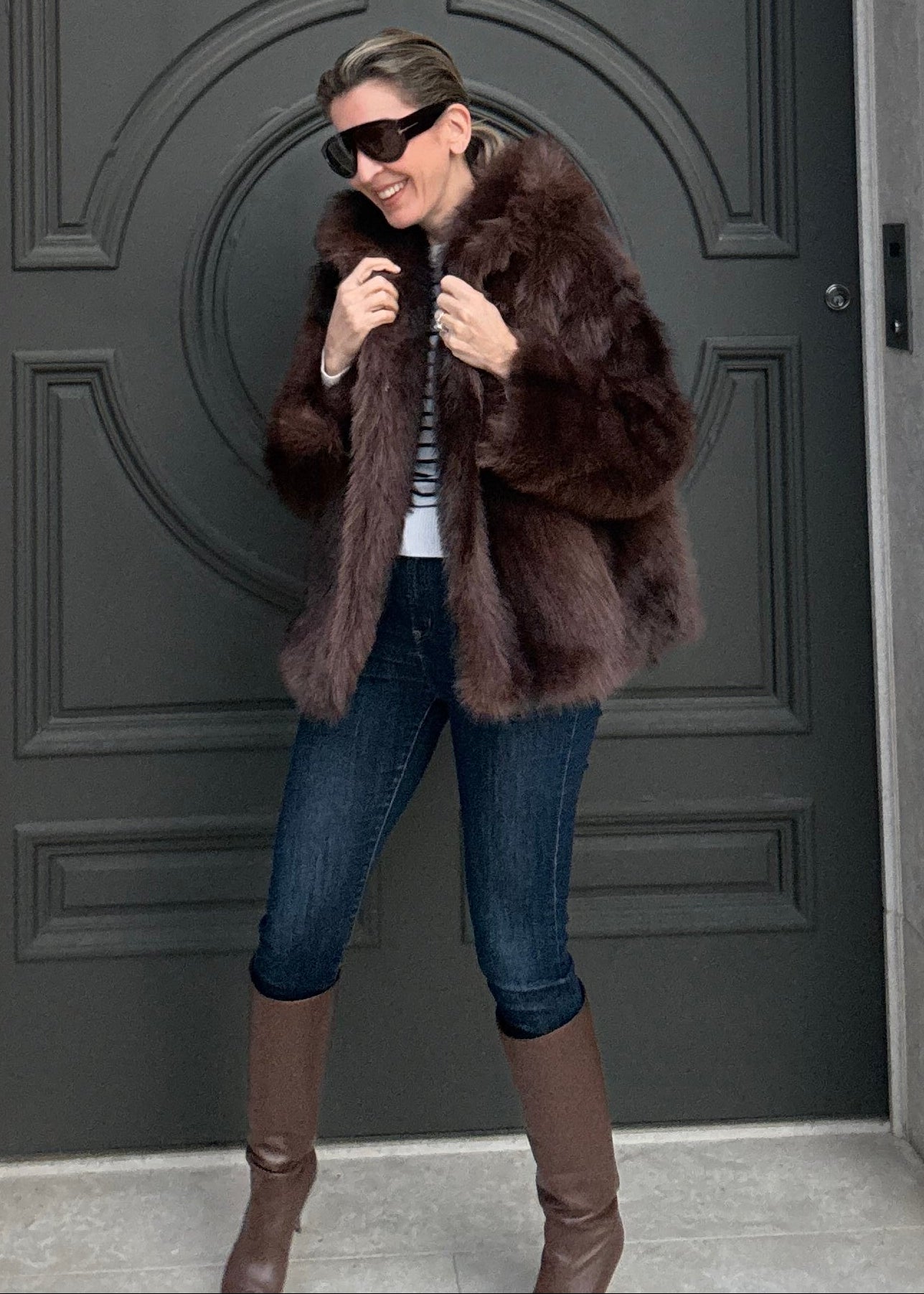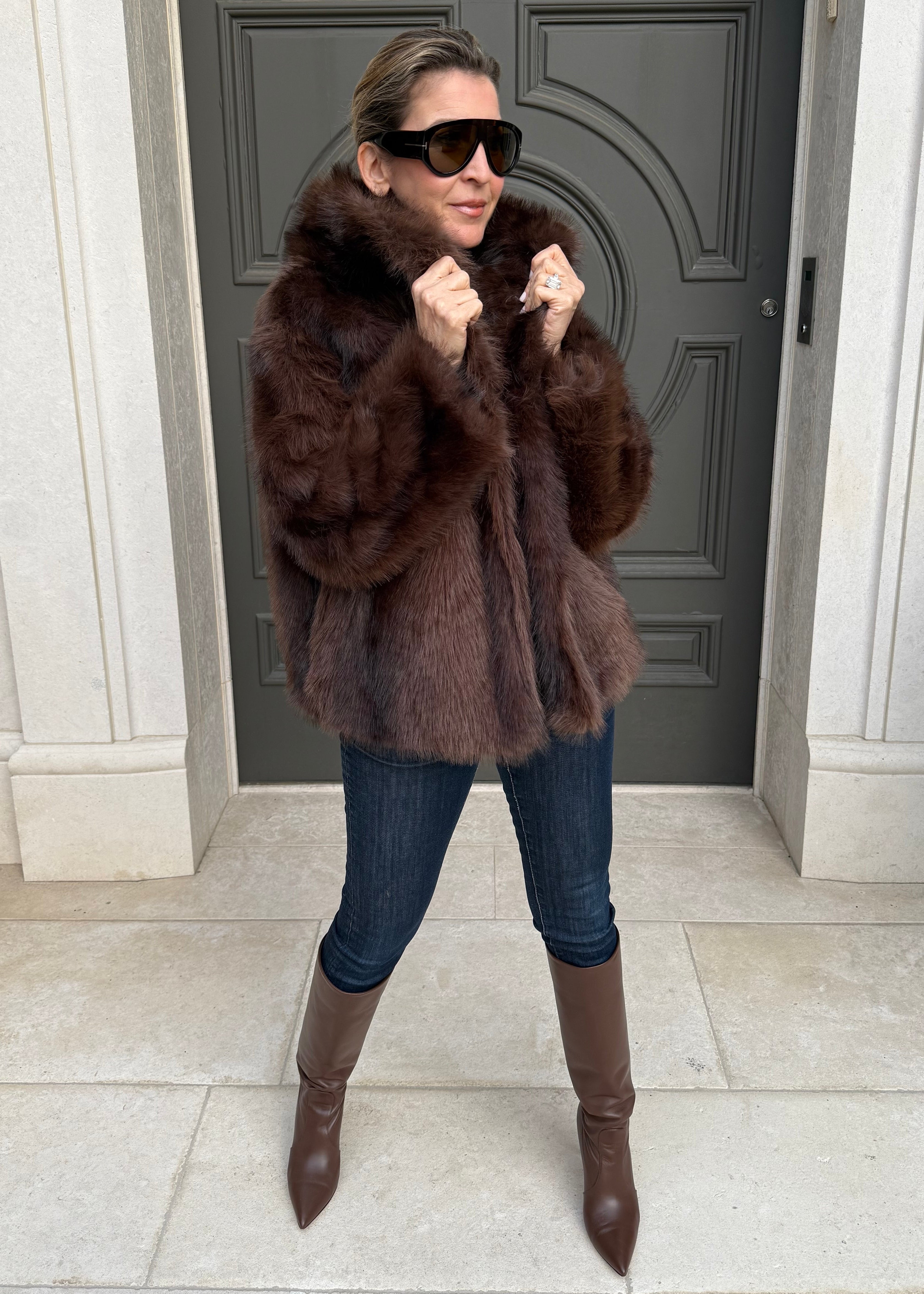 Step out in understated luxury with the Merlot Faux Fur Coat. Crafted from rich chocolate brown faux fur, this long-sleeve coat features a streamlined silhouette which offers warmth and effortless style, making it an essential piece for everyday wear with a modern twist.