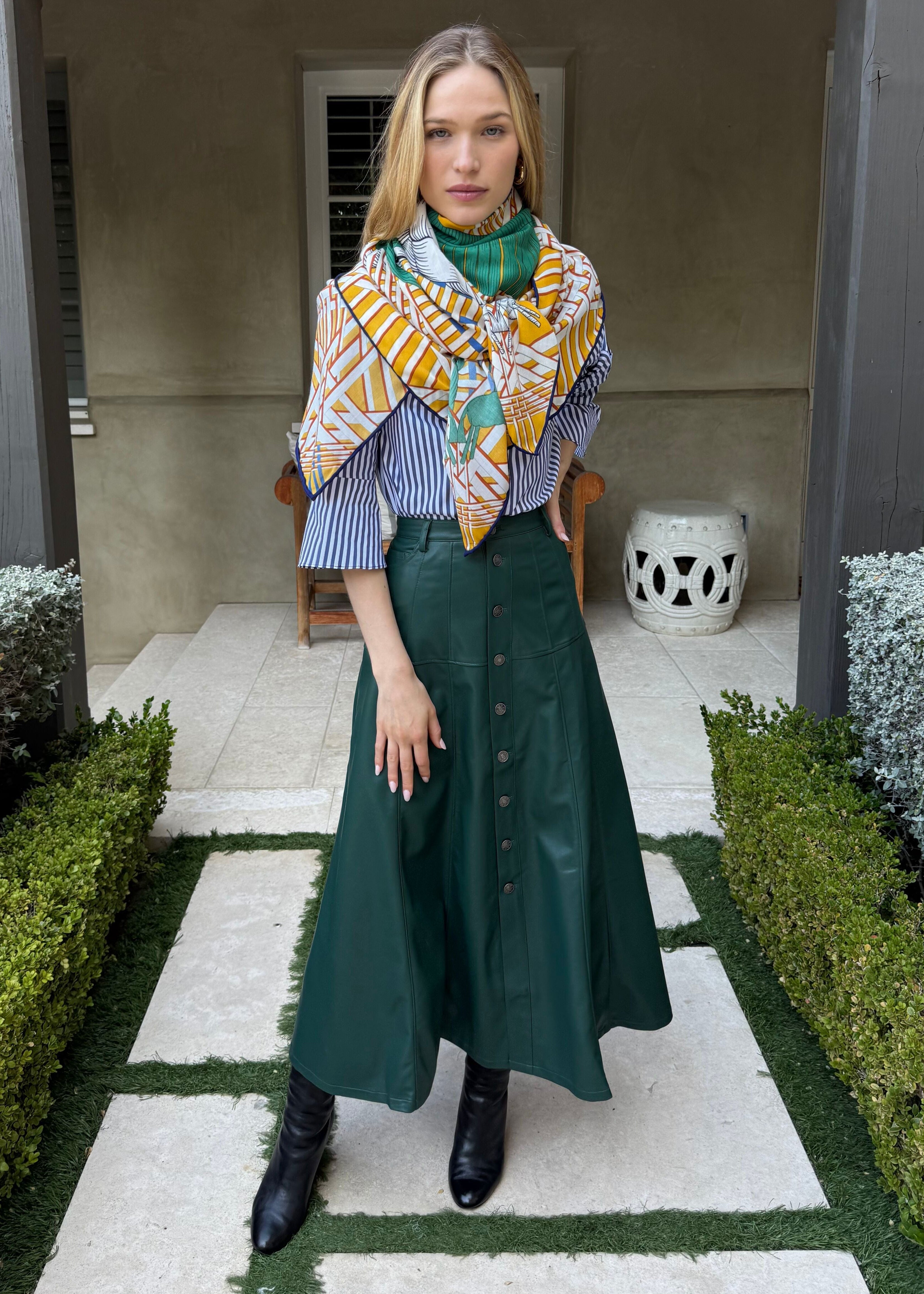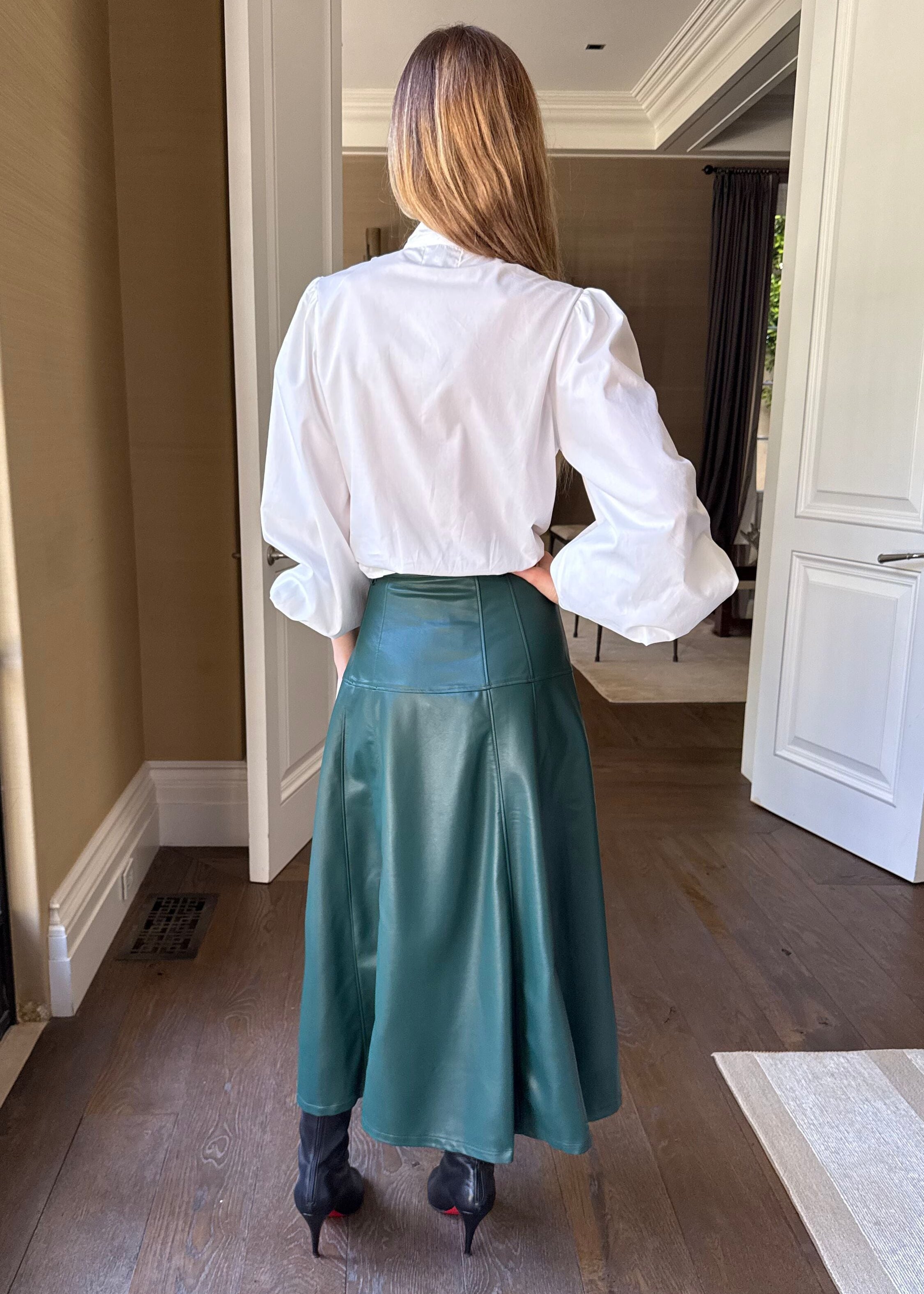 The Maude Faux Leather Button Front A-Line Midi Skirt in Hunter Green features a sleek silhouette with button-front detailing. Its A-line shape offers a flattering fit and versatile style, perfect for elevating any outfit with a polished, expert touch.