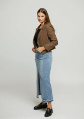 The Taylor Slit Denim Maxi Skirt redefines casual chic, offering a versatile choice for various occasions. Whether paired with a simple tee or a blouse, this skirt promises to become a staple in your collection – embodying both comfort and contemporary fashion.