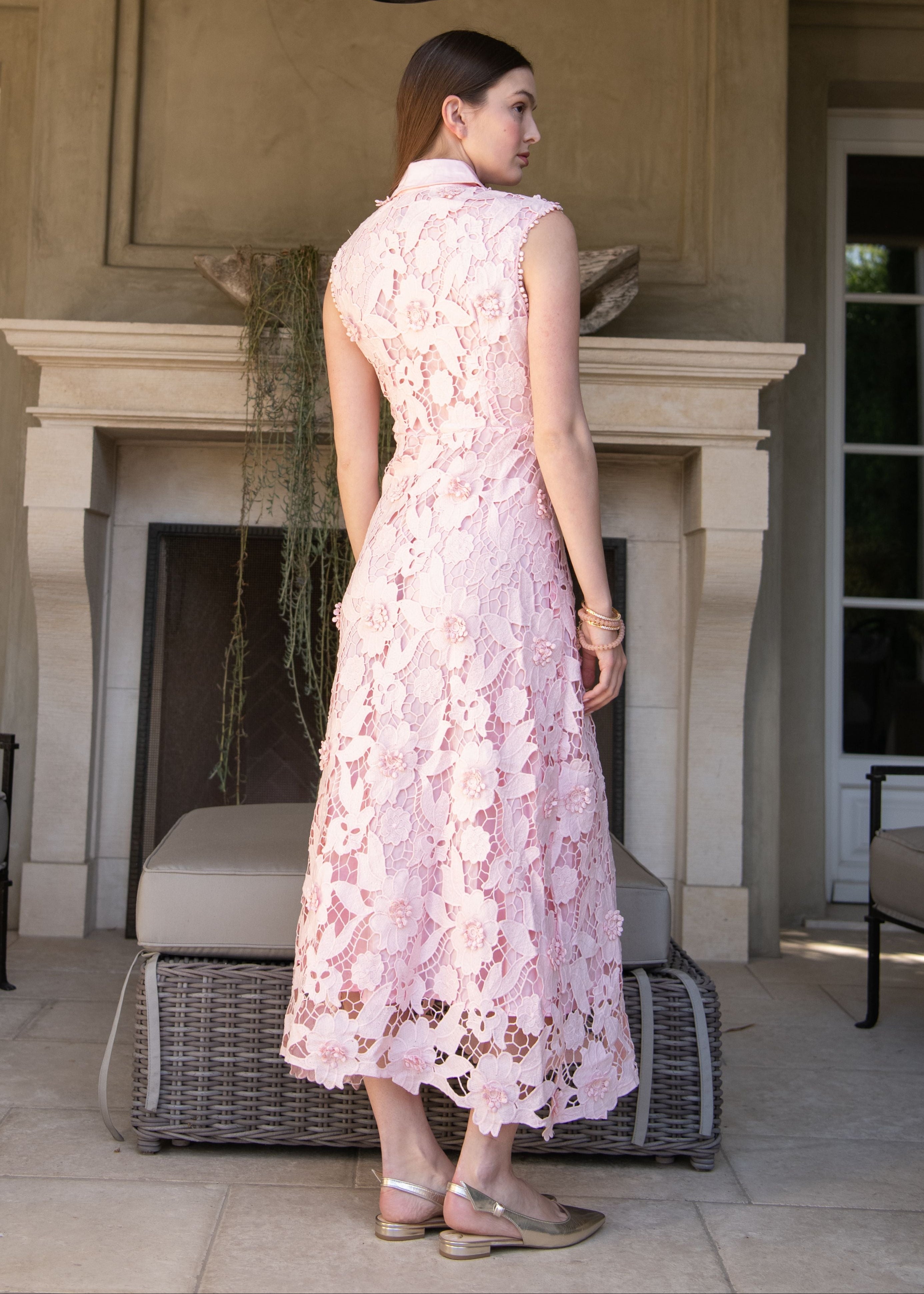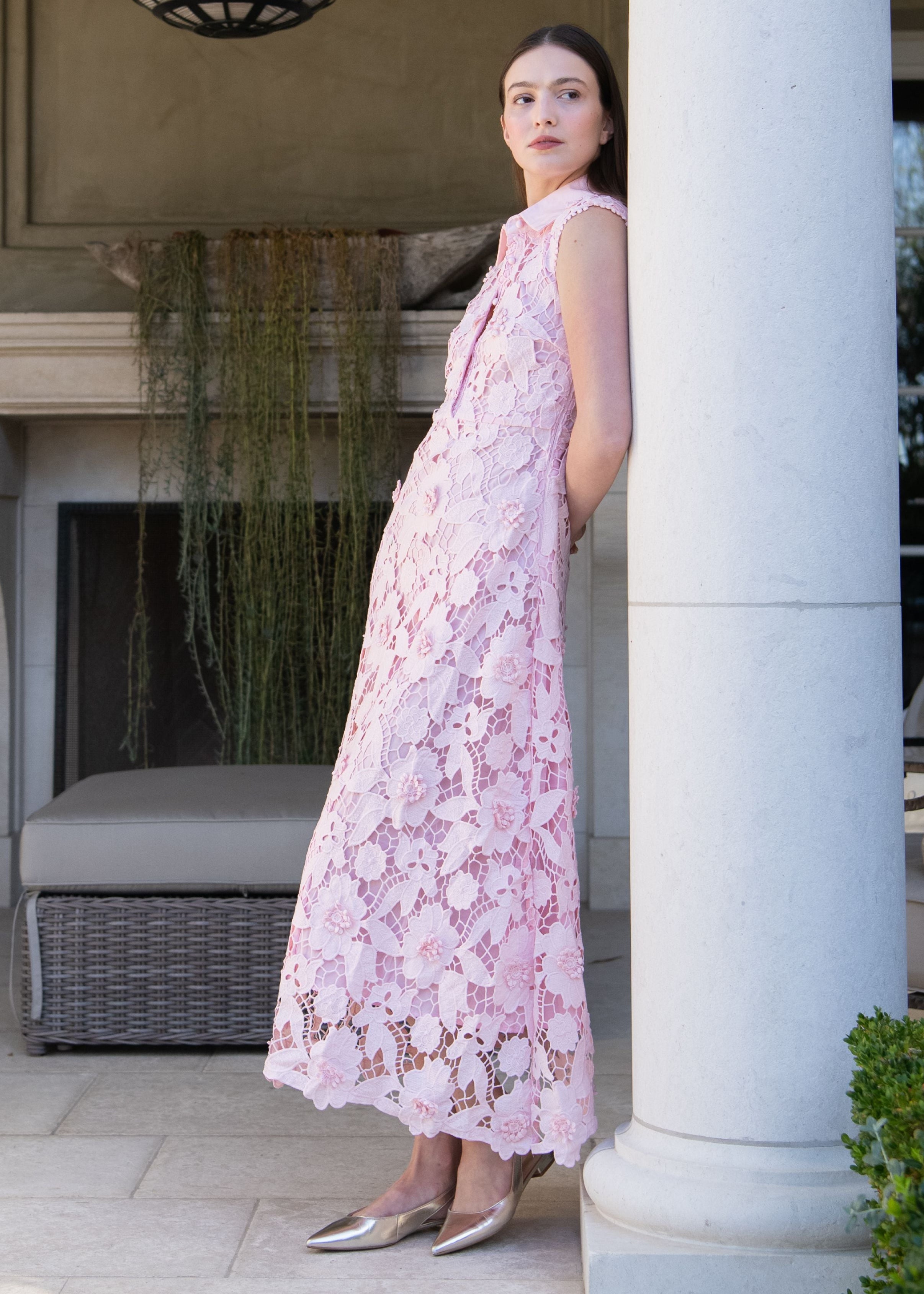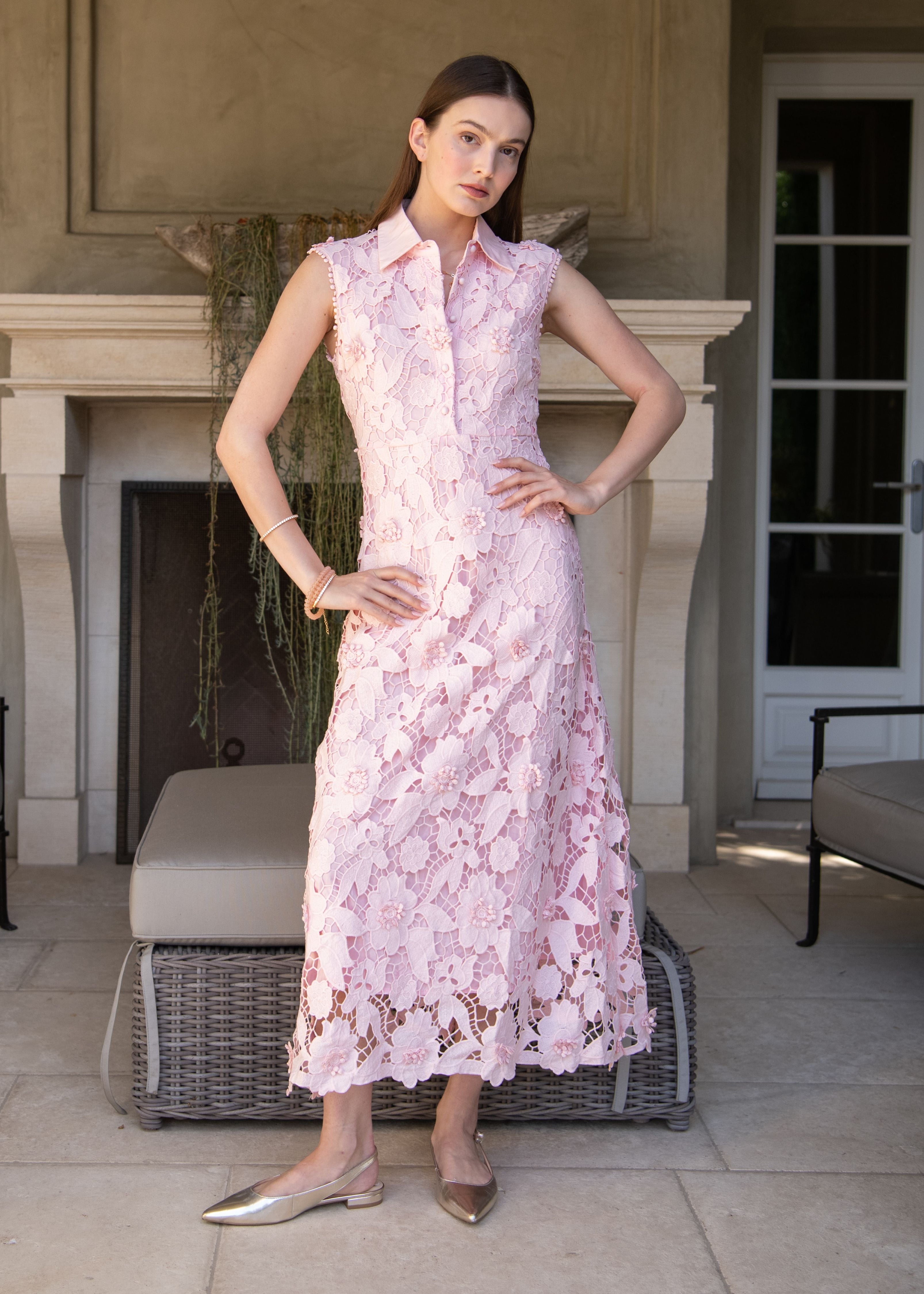 Delphia Collared Floral Lace Maxi Dress - Light Pink