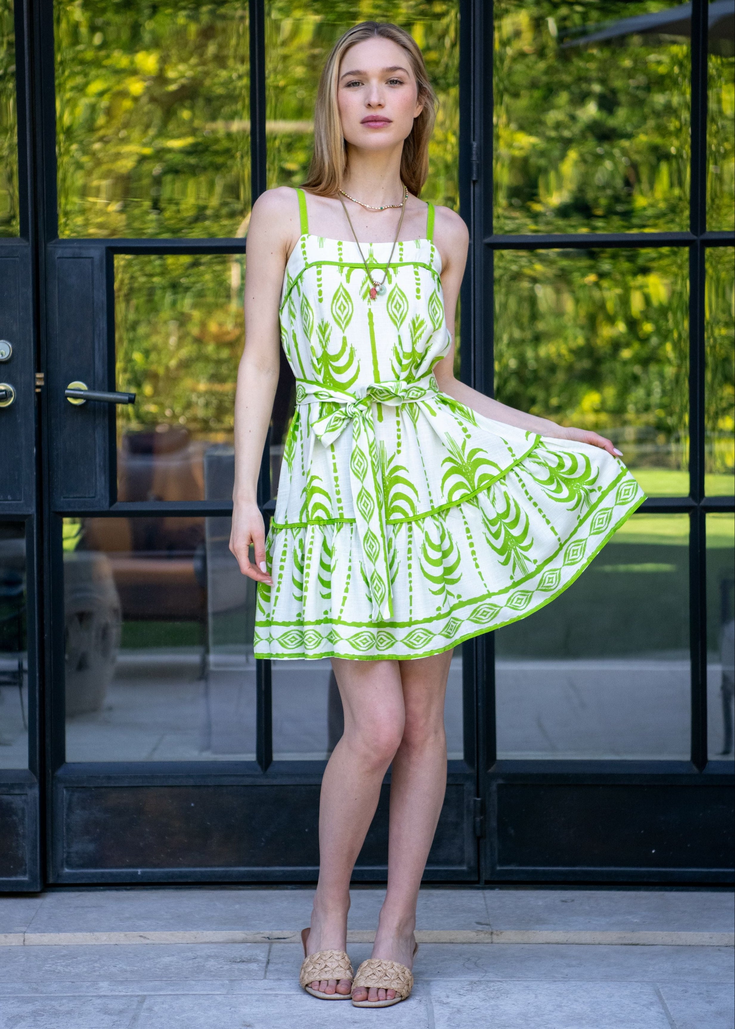 Evita Ivory and Green Printed Tie Waist Mini Dress