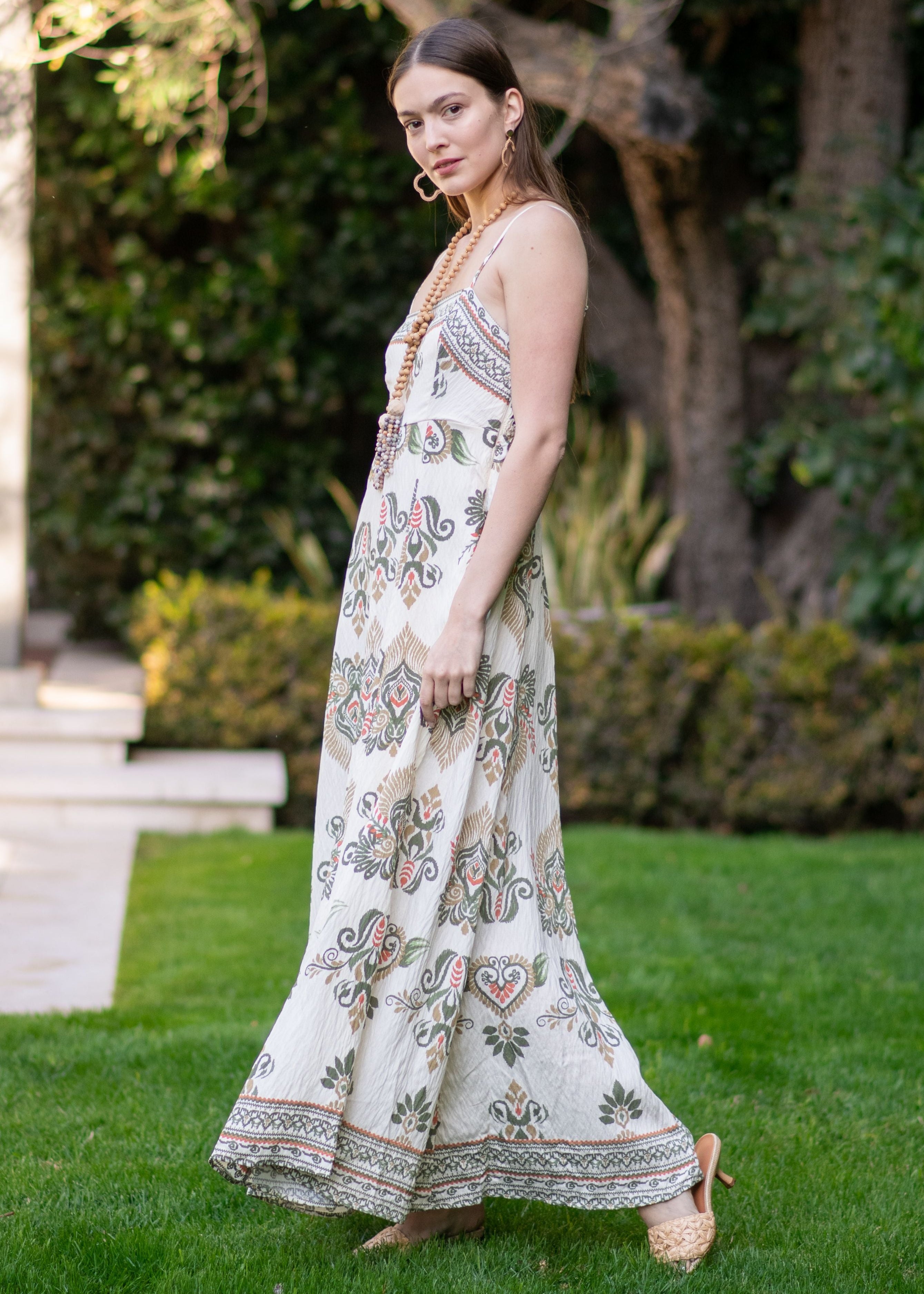 Twirl into spring in this Genesis maxi dress, where soft cream and verdant green prints dance together in perfect harmony. Effortlessly chic and wonderfully comfortable, it's your go-to for everything from casual brunches to garden parties. Pure joy in fabric form.