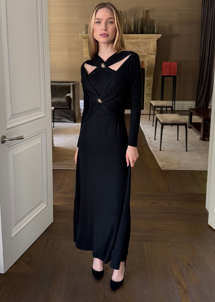 Krisandra Twist Detail Gold Ring Cutout Maxi Dress - Black