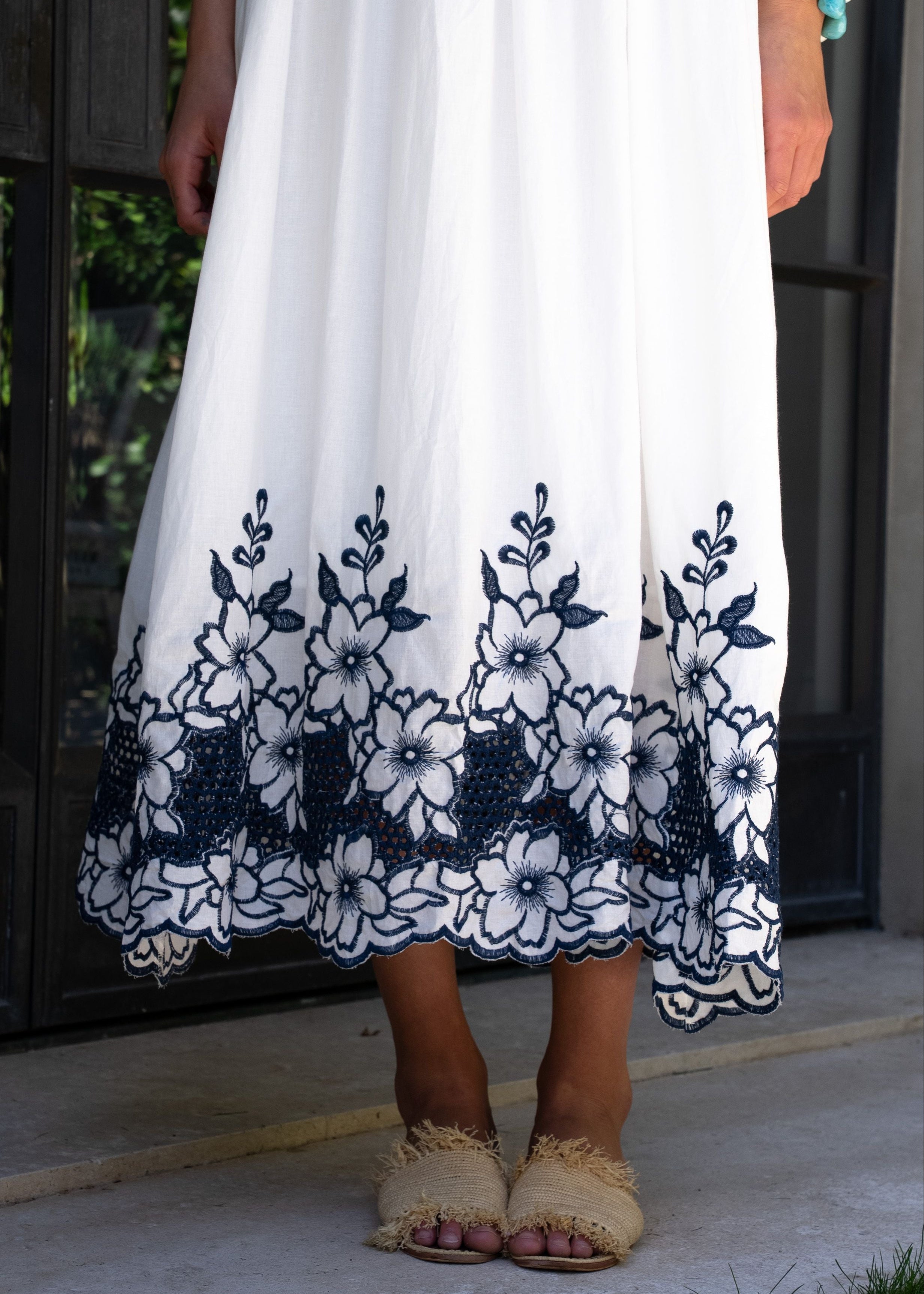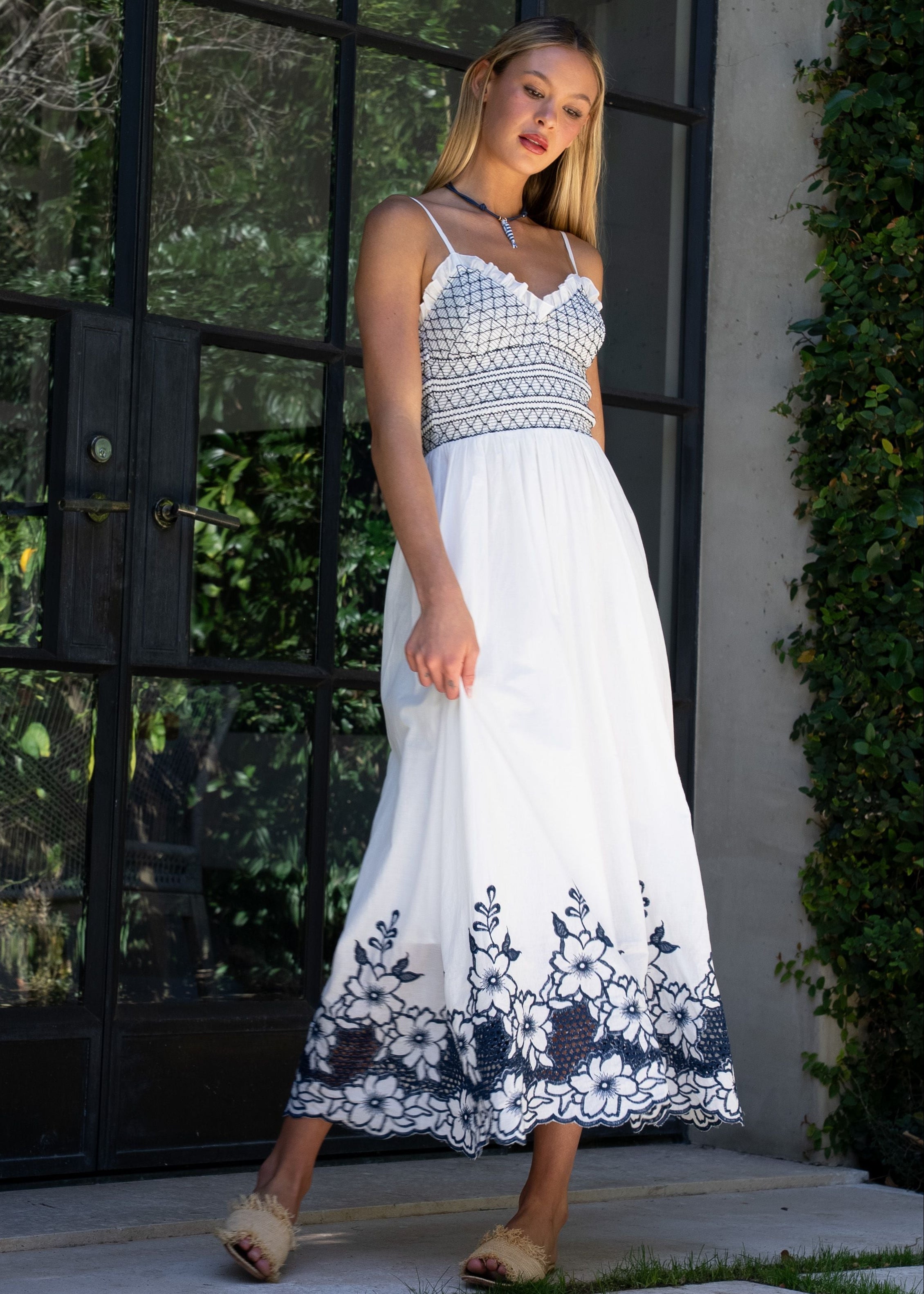Samira Smocked Bodice Floral Embroidery Midi Dress - Navy