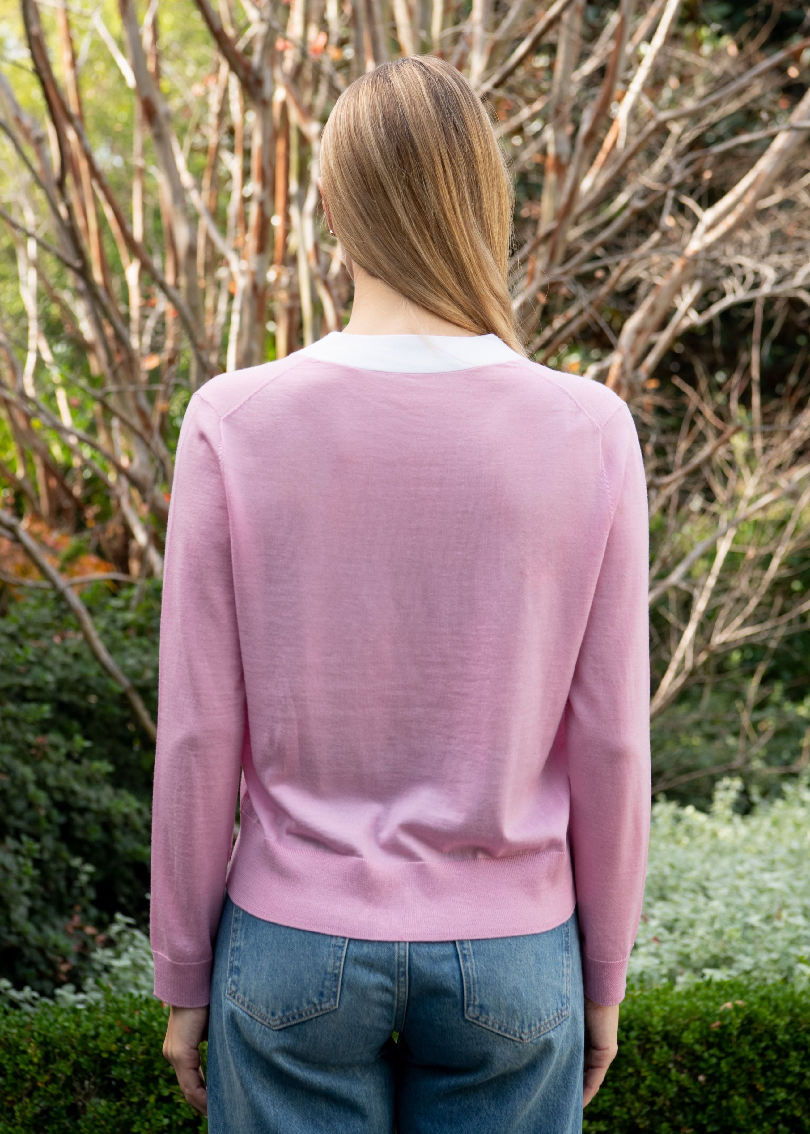Isabella Pink Merino Wool Cardigan with White Trim