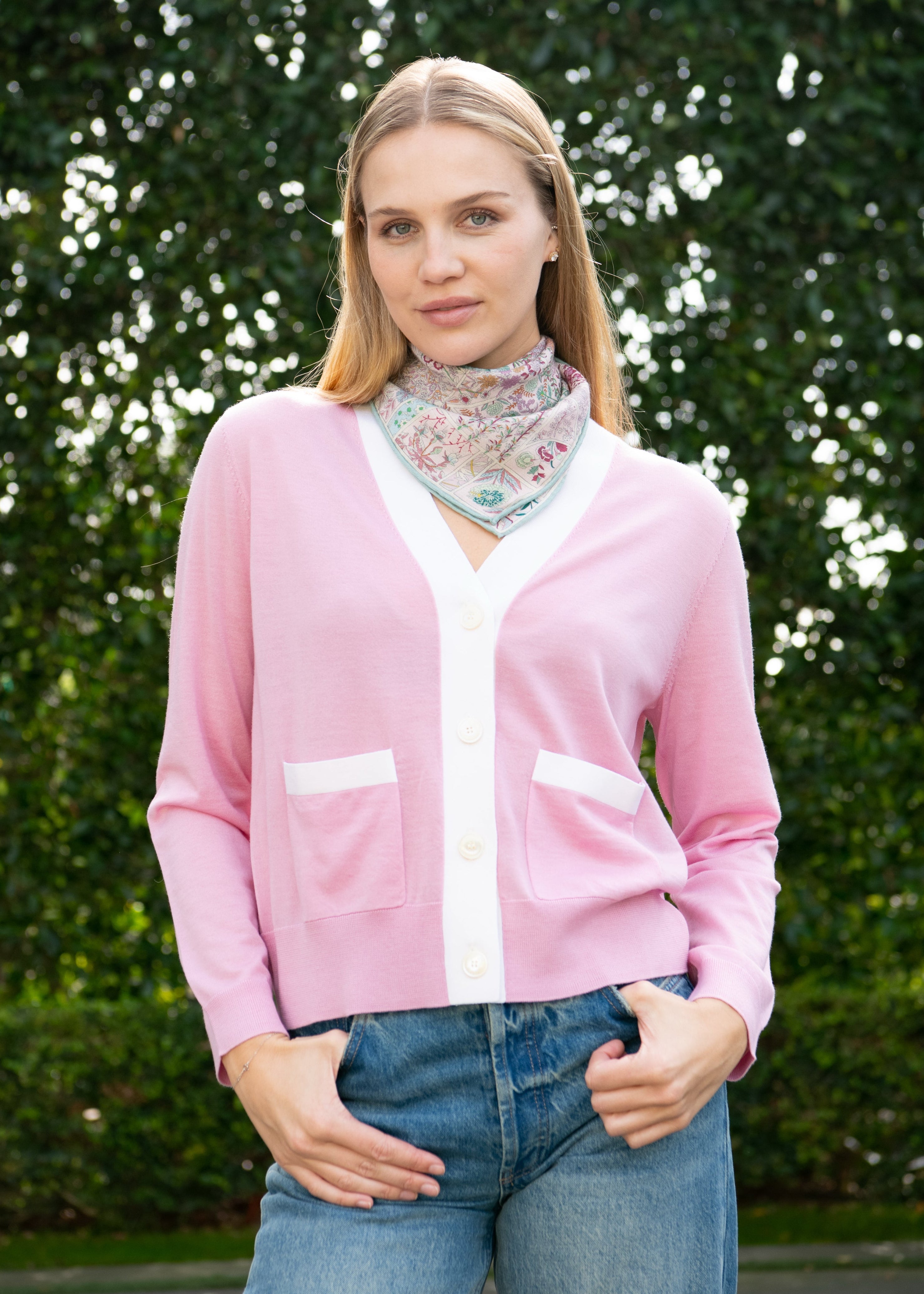 This Isabella cardigan brings together premium merino wool and fun-loving flair in one delightful package. A blush pink base accented with clean white trim delivers instant charm to your everyday looks. Lightweight yet wonderfully warm, it's the versatile layer that makes getting dressed feel playful and effortless.