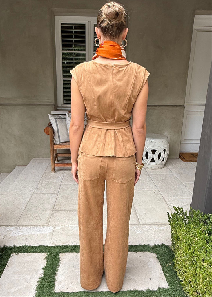 Gwen Suede Belted Cap Sleeve Peplum Top - Camel