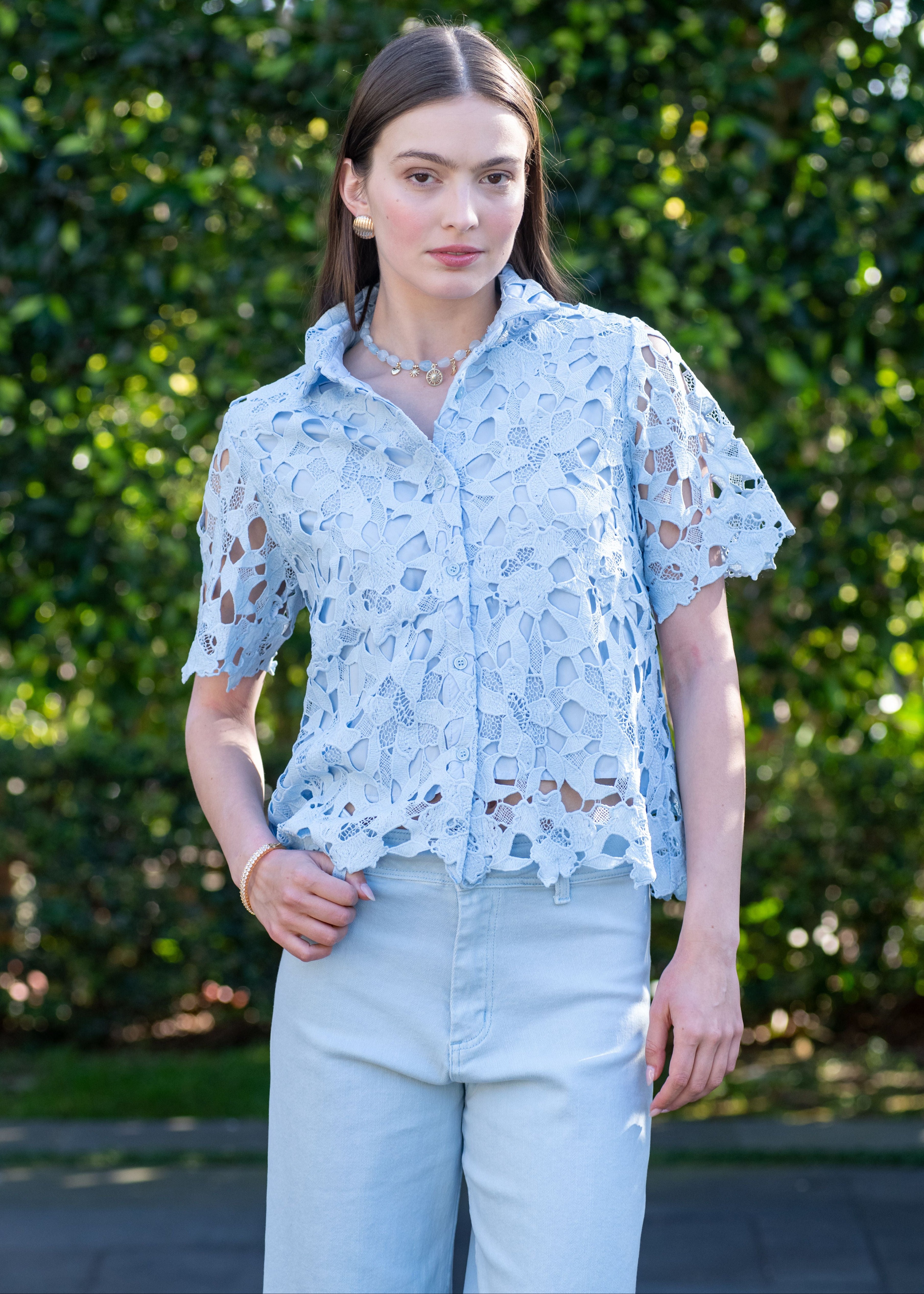 Crisp and charming, this collared button-down pairs timeless style with delicate lace detailing. Perfect for dressing up casual moments or keeping things effortlessly put-together. A versatile wardrobe essential that works as hard as you do.