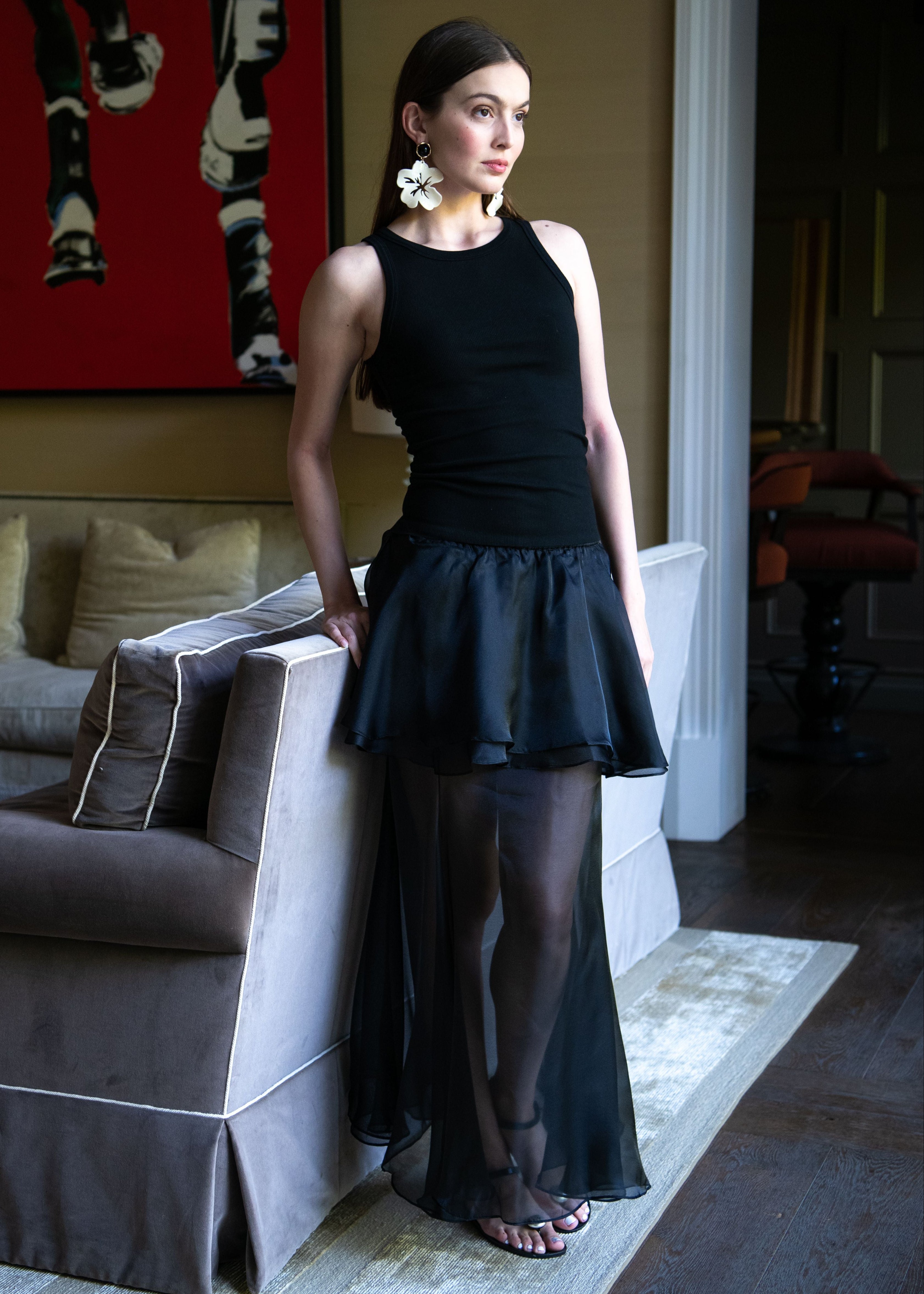 - Sheer midi-maxi length skirt