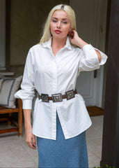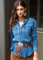 Add a touch of western charm to your outfit with this playful vegan suede belt. The brown band pairs perfectly with the delicate silver floral concho buckle, bringing feminine flair to a classic cowboy style. Perfect for adding a little fun and edge to your look!