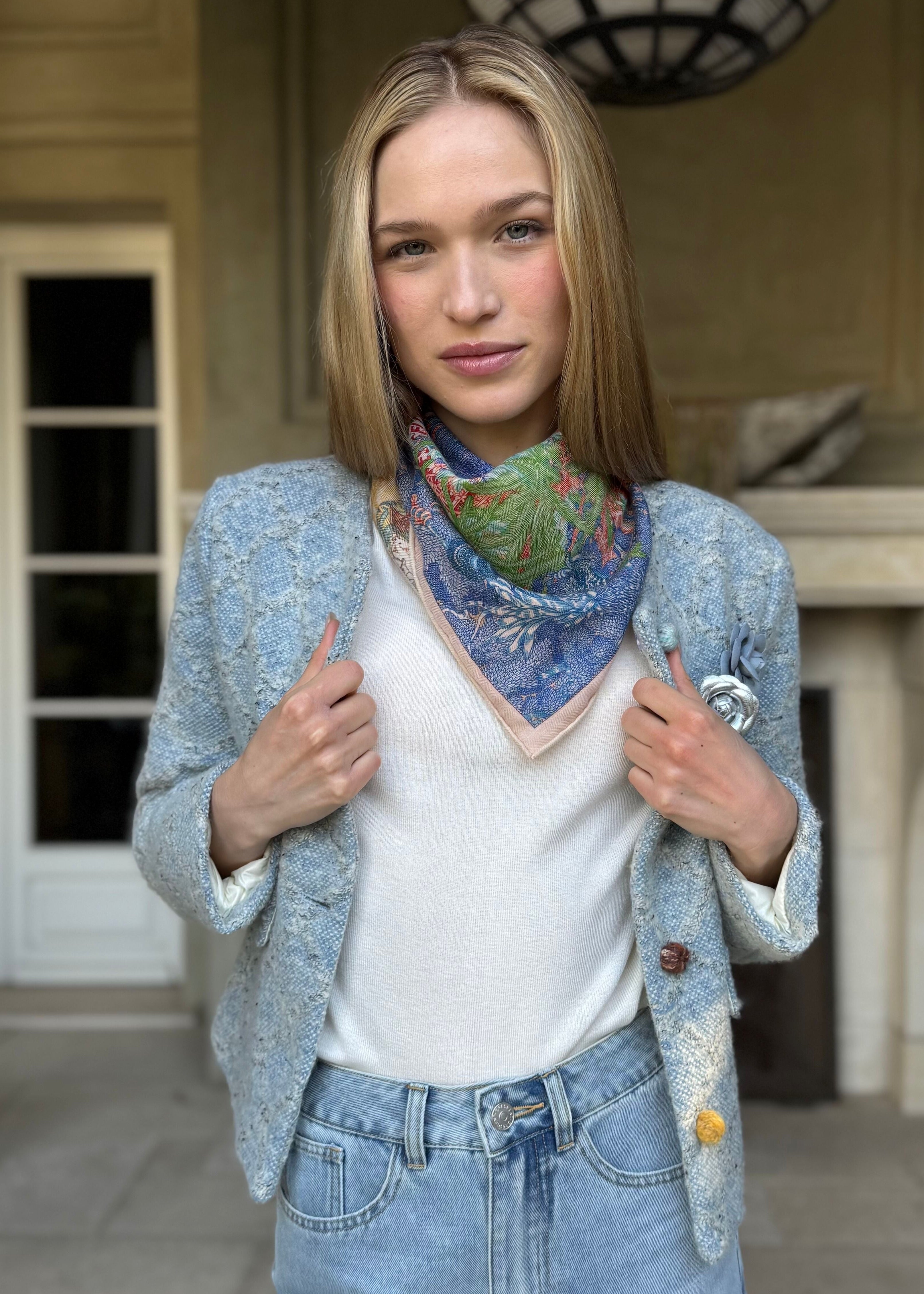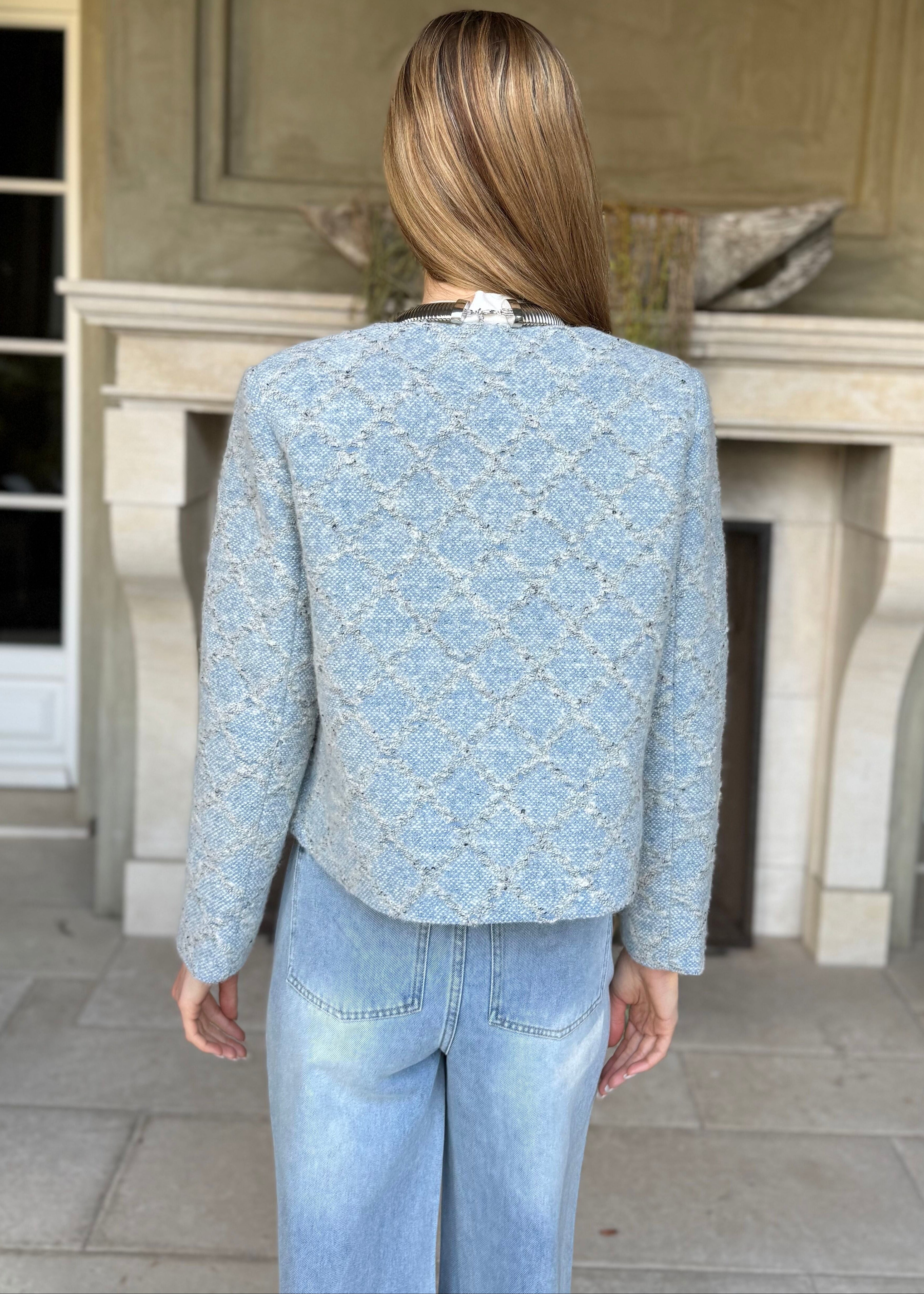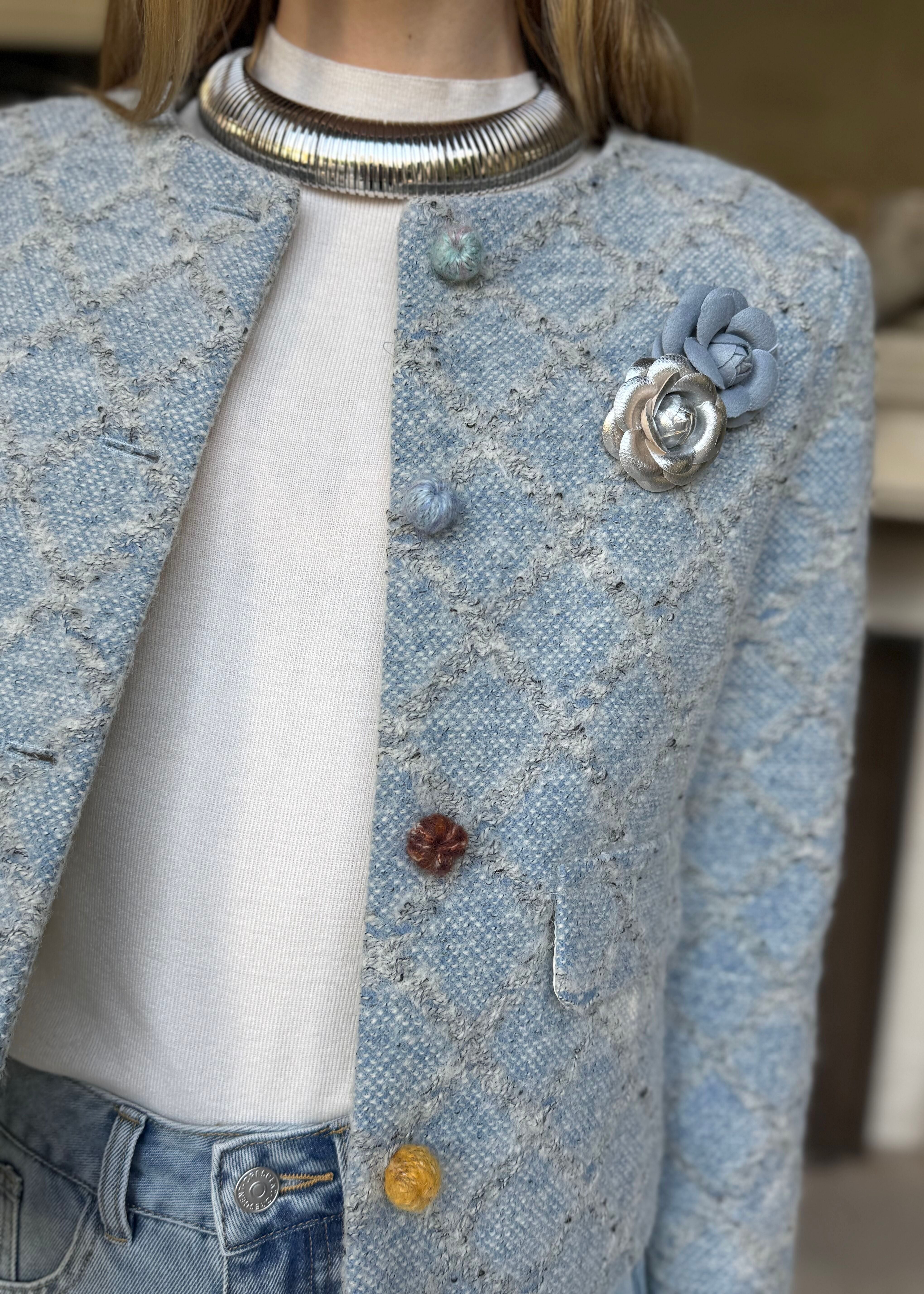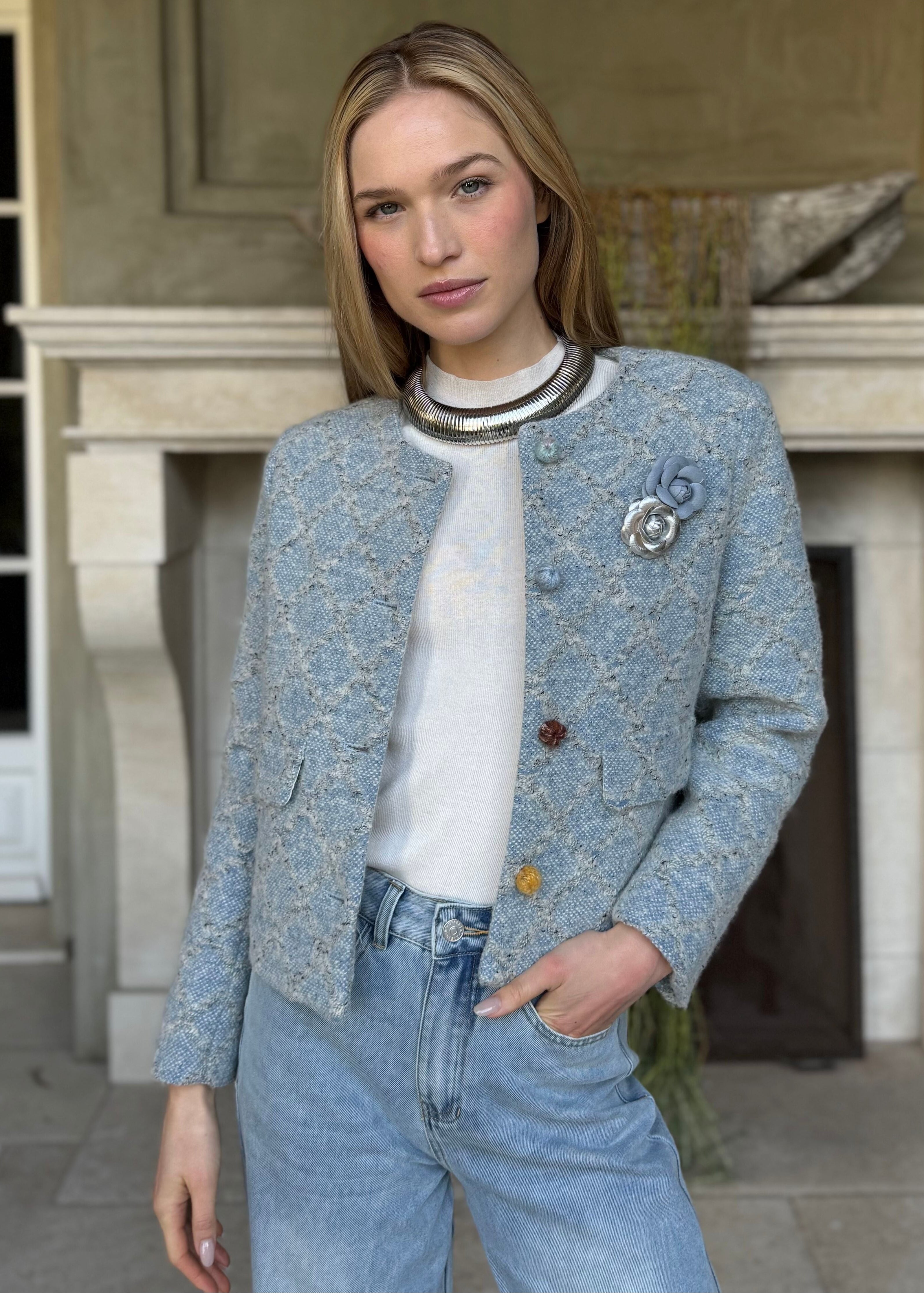 Introducing April—your new favorite layer that blends preppy charm with botanical flair. This light blue checkered jacket gets a delightful upgrade with playful floral appliques that dance across the fabric. Whether you're heading to brunch or running errands, it's the perfect companion for adding personality to any look.