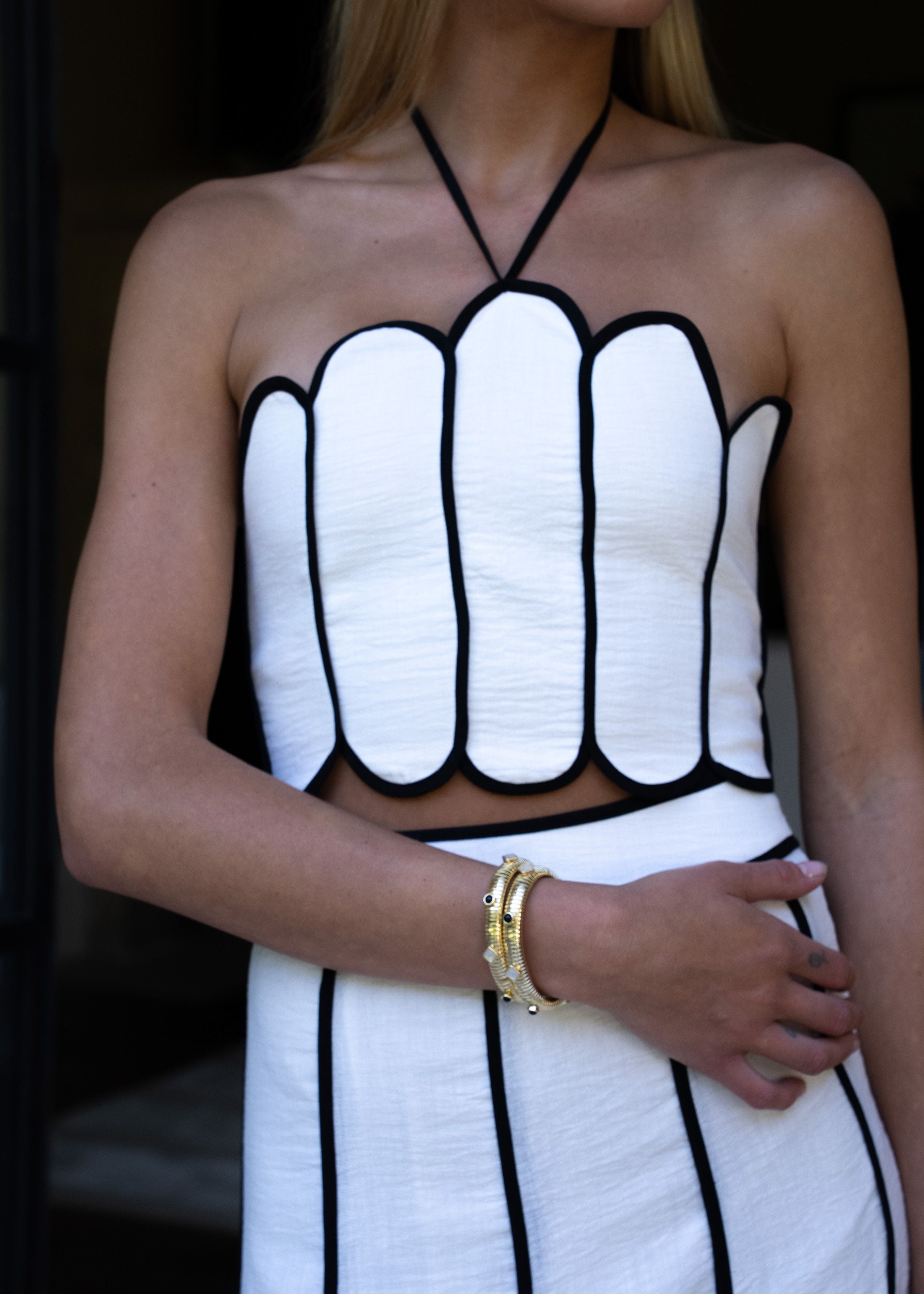 Flirty cross-neck halter crop top that's equal parts chic and fun. The black and white colorway keeps things classic while the cropped cut brings modern edge. Perfect for layering or going solo when you're ready to turn heads.