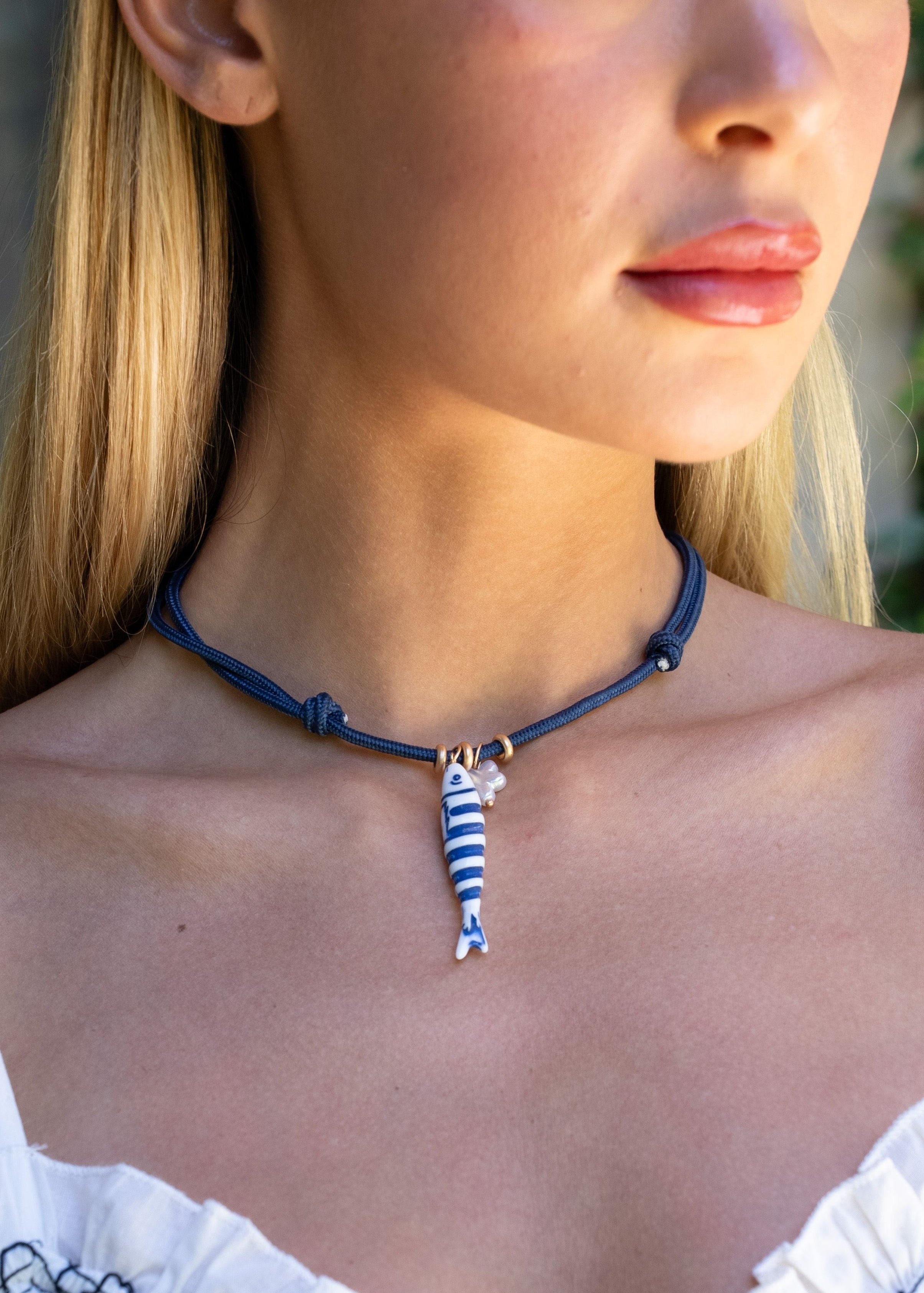 Clayton Ceramic Fish Pendant Navy Rope Necklace