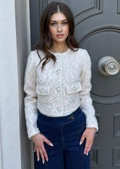 The Emmie Boucle Jacket features a refined boucle texture and a distinctive contrast edge trim, offering a polished yet contemporary silhouette. The cut provides versatile layering that enhances both professional and casual ensembles with subtle sophistication.