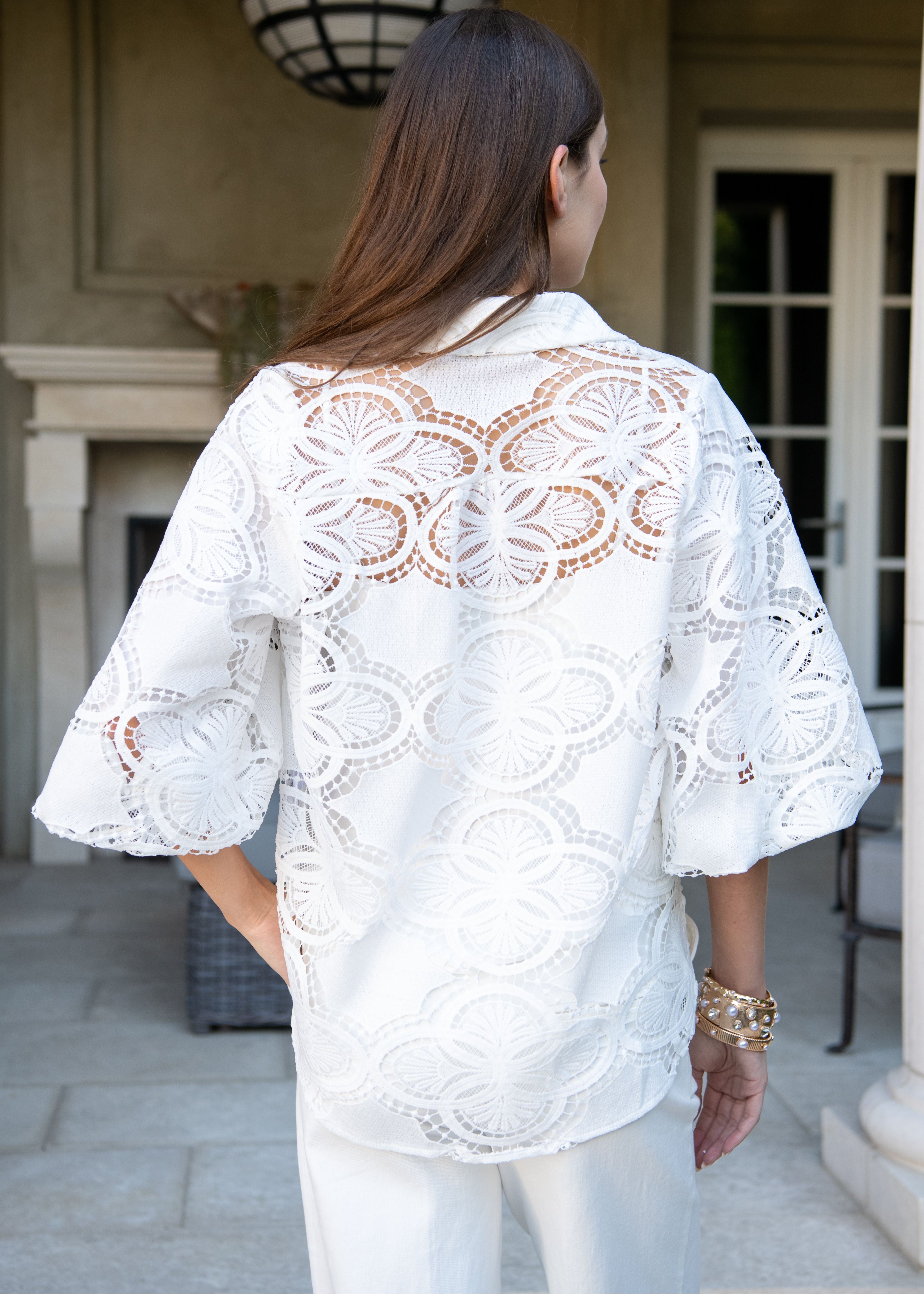 A timeless button-up with intricate lace detailing and a polished collar. Short puff sleeves deliver romantic flair, while the tailored silhouette works for any occasion. Layer it or wear it standalone—this piece effortlessly moves from casual to dressy.