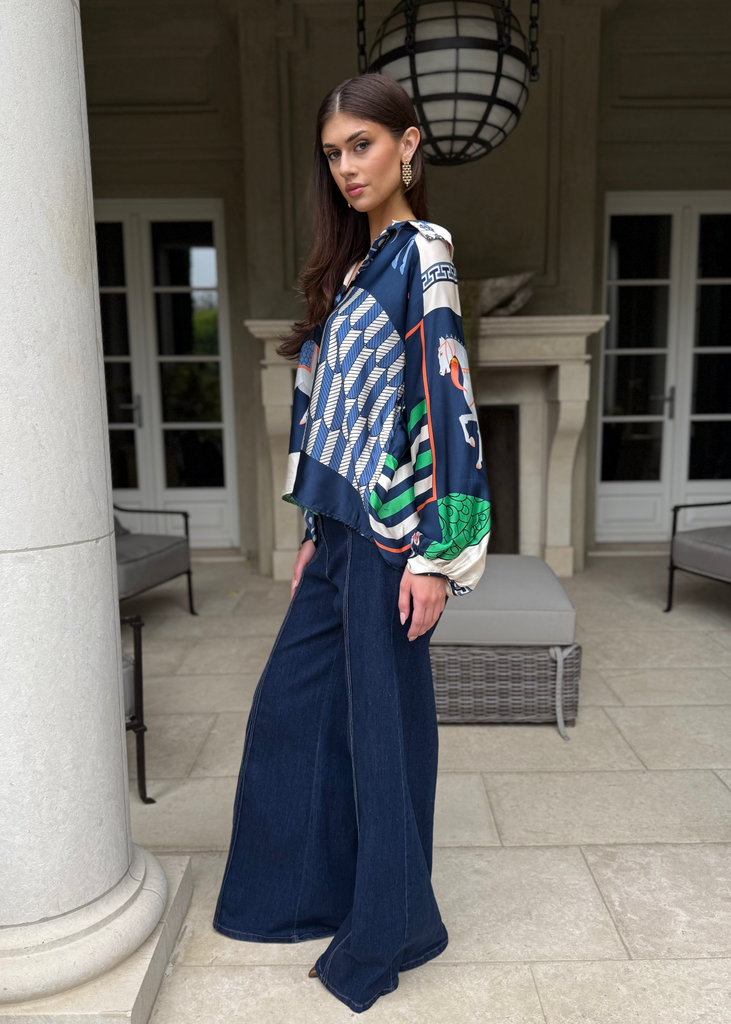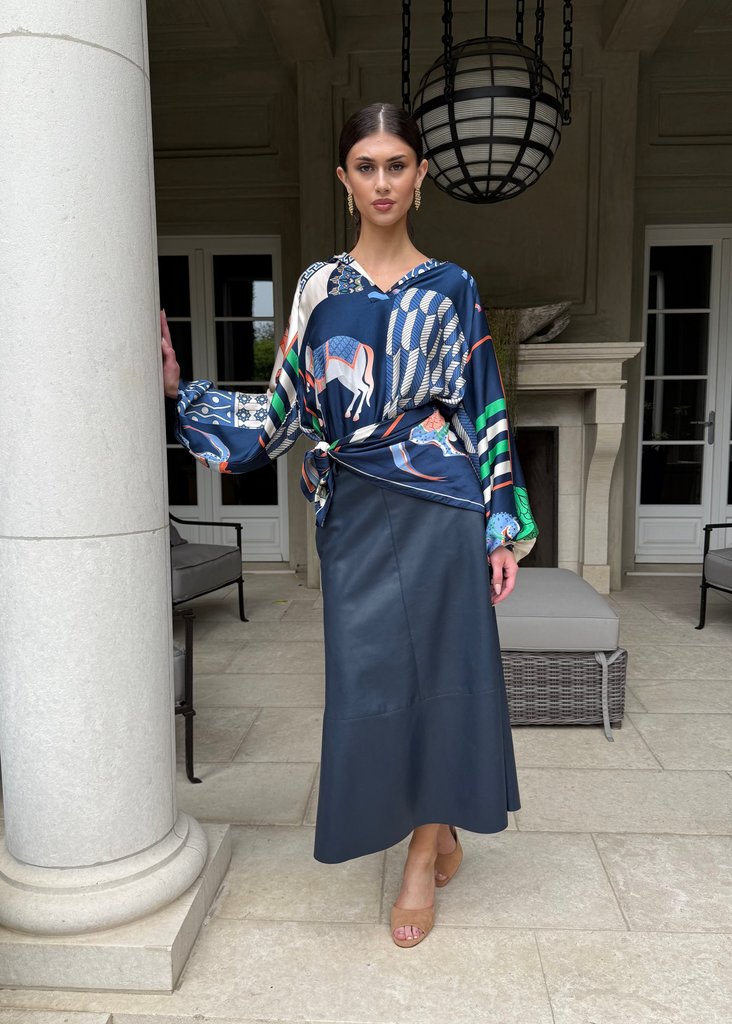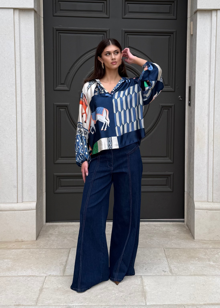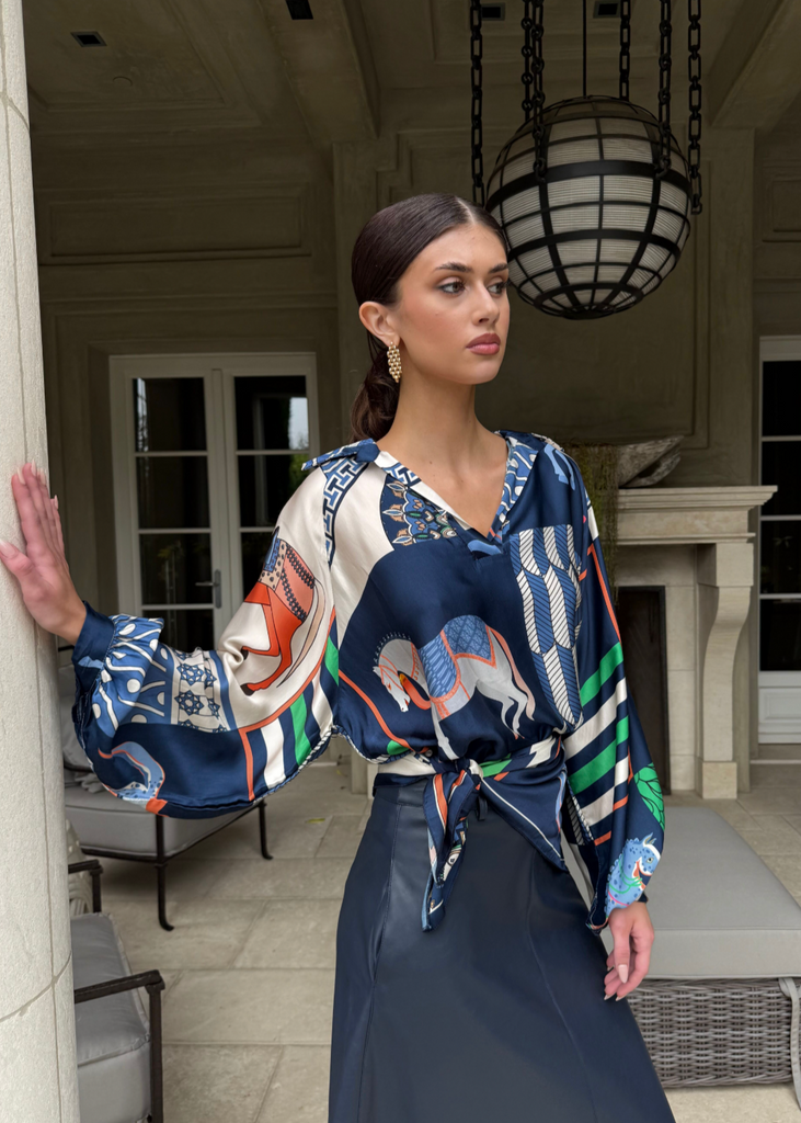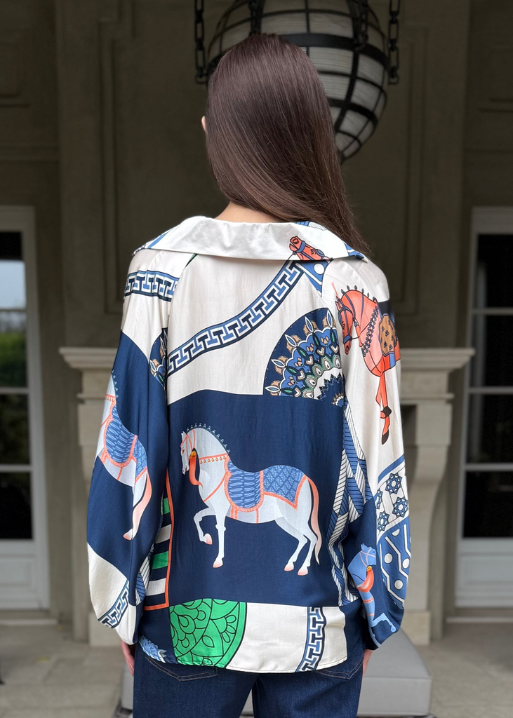 Amara Equestrian Print Silky Top - Navy