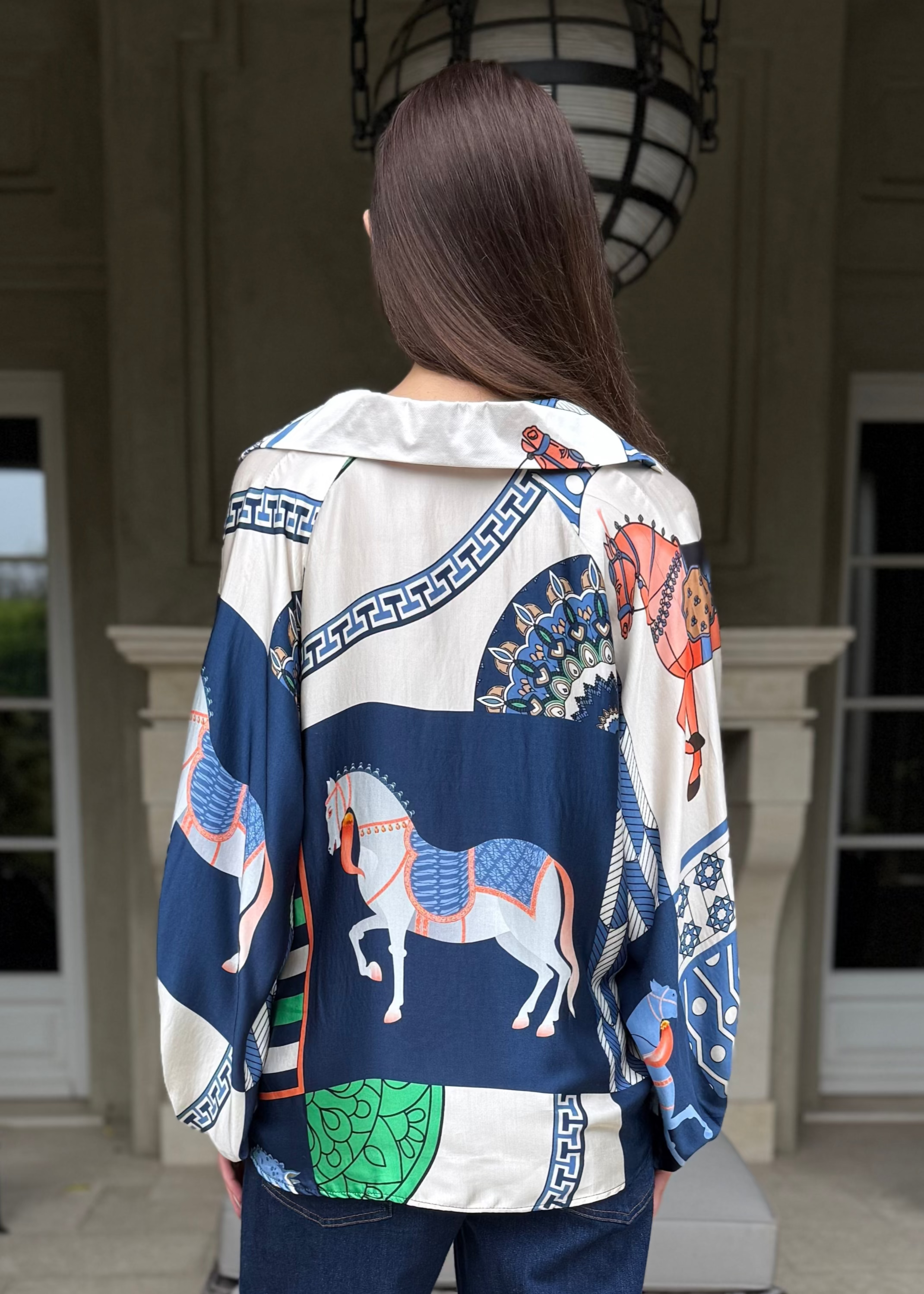 Elevate your everyday look with the Amara Blue Equestrian Print Silky Top — a striking blend of relaxed elegance and bold, equestrian-inspired design. With its silky-smooth finish and eye-catching horse motif, Amara is made to move effortlessly from lounging to luxurious escapes.