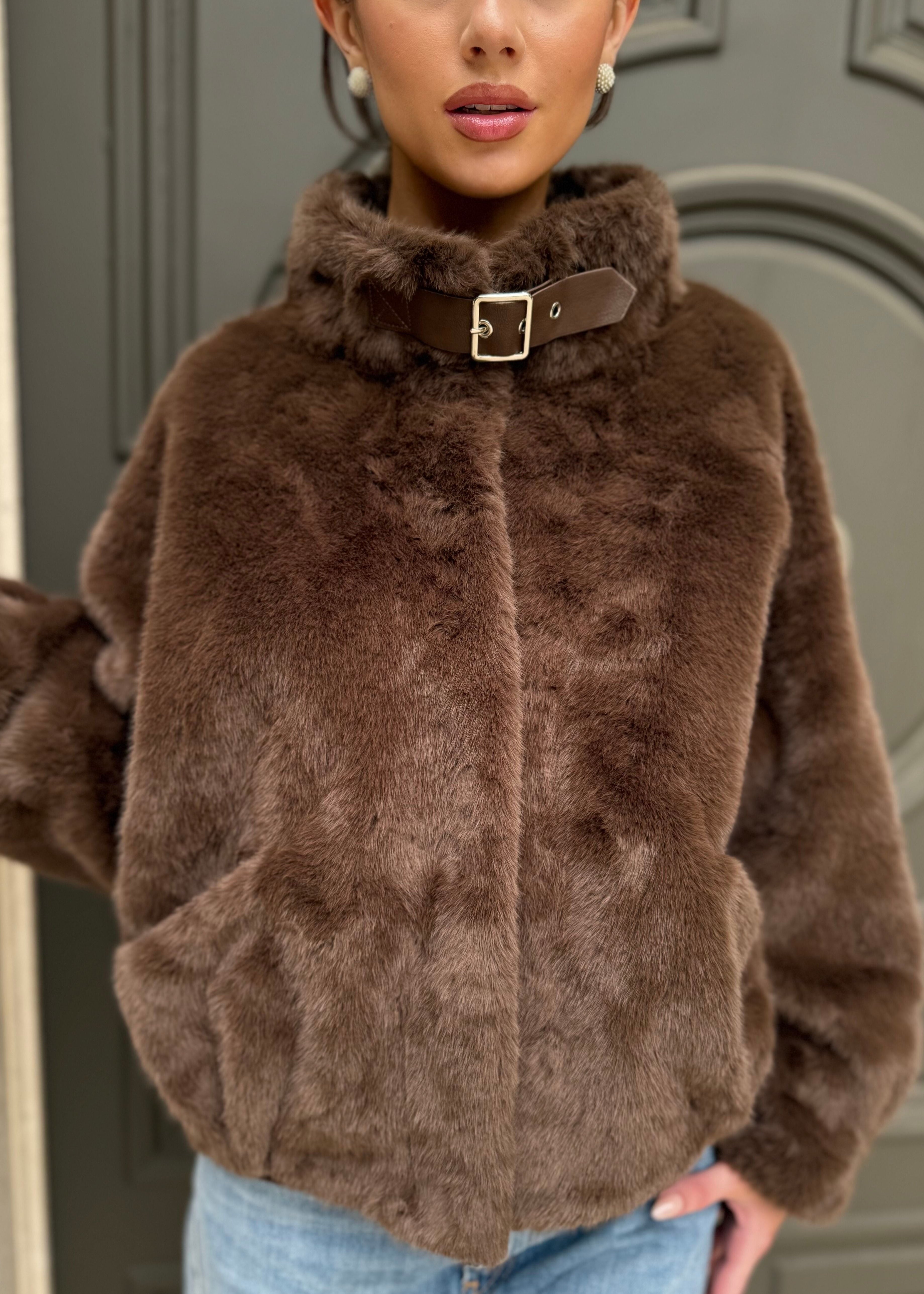 Step out in understated luxury with the Margaux Faux Fur Coat. Crafted from rich chocolate brown faux fur, this long-sleeve coat features a sleek buckle strap collar that adds a sporty yet sophisticated edge. Its streamlined silhouette offers warmth and effortless style, making it an essential piece for everyday wear with a modern twist.