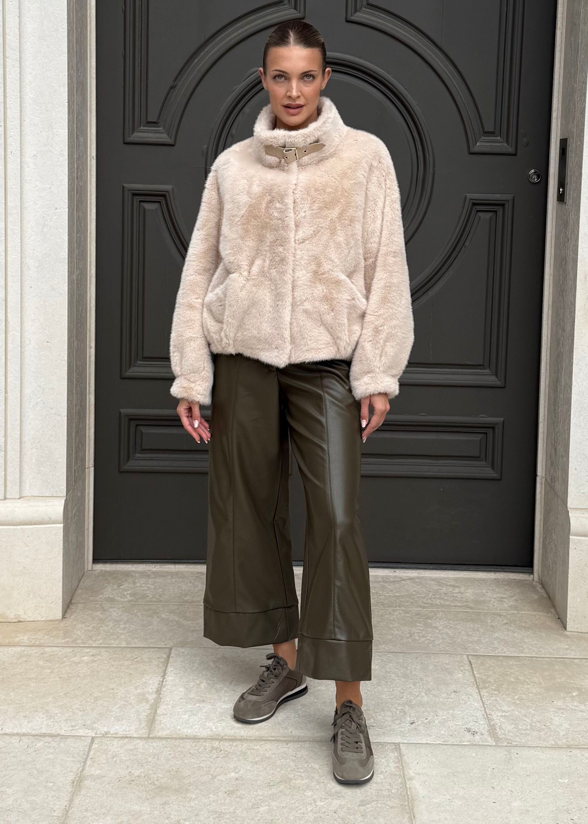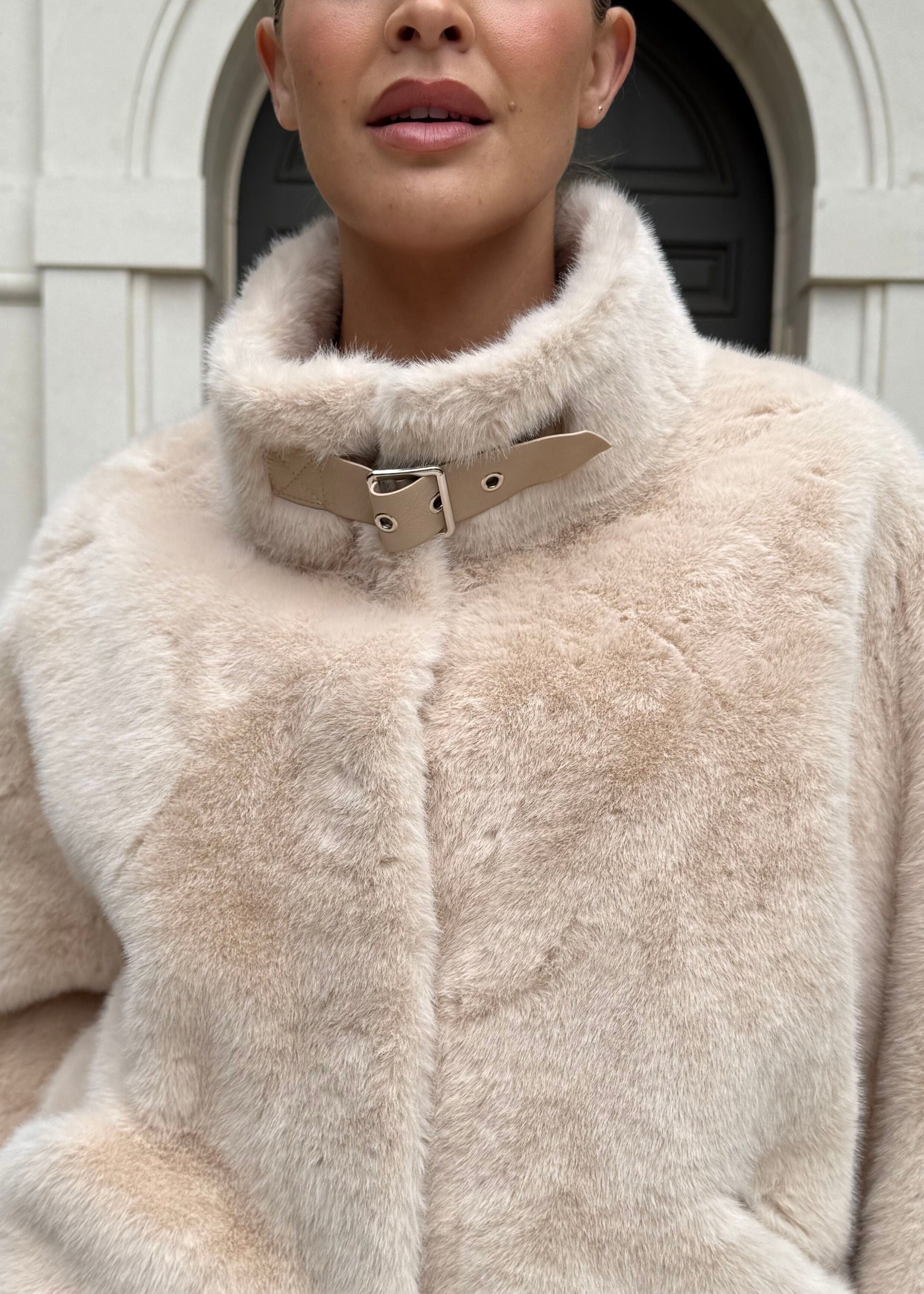 Margaux Buckle Strap Collar Long Sleeve Faux Fur Coat - Cream
