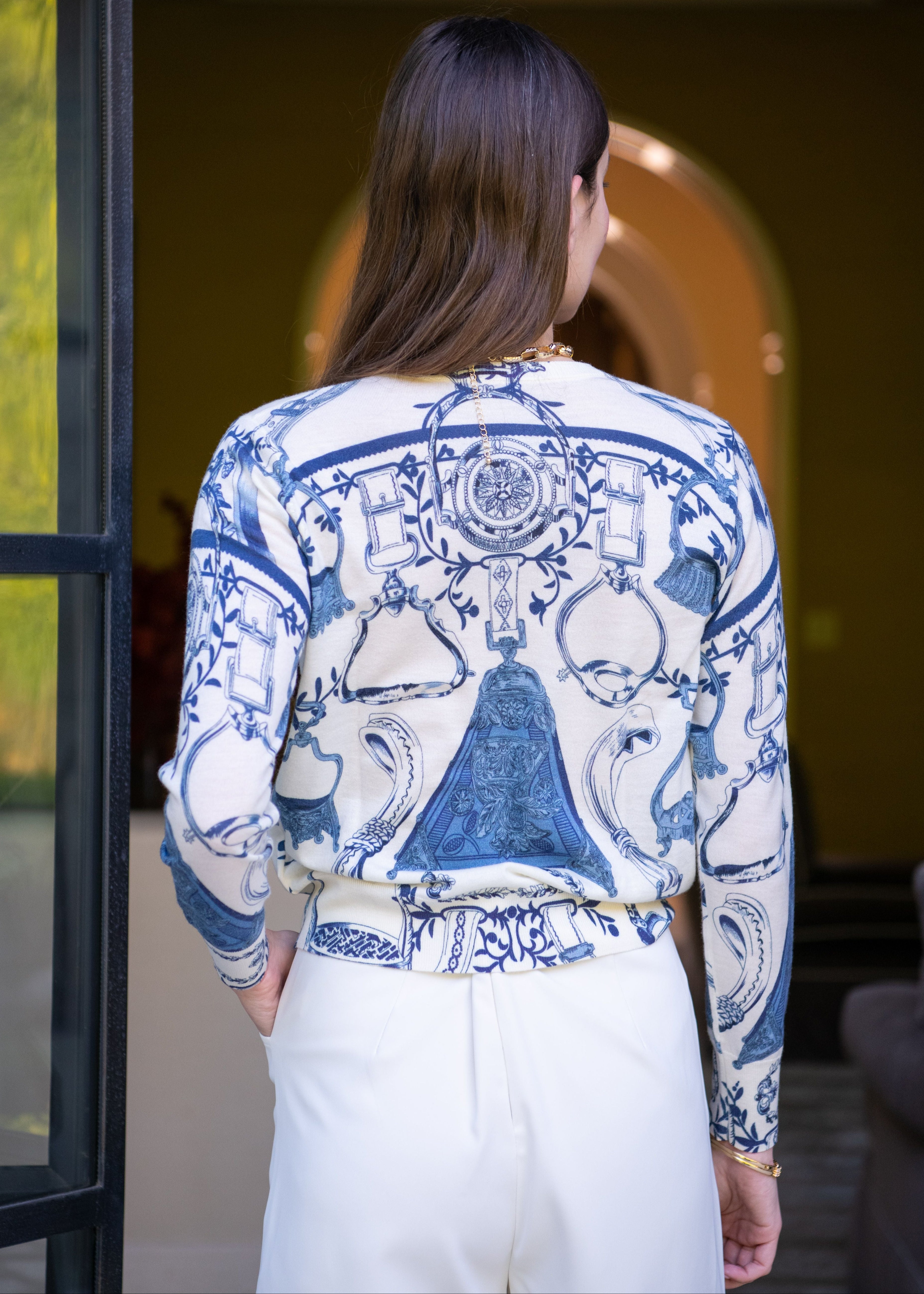 The Marielle adds timeless elegance to your everyday wardrobe with its refined navy-and-white geometric pattern, inspired by fine china. This sophisticated design makes it a standout piece that enhances any outfit with style and charm. Lightweight and versatile, The Marielle is perfect for layering or wearing on its own, bringing a modern, creative elegance to your look.