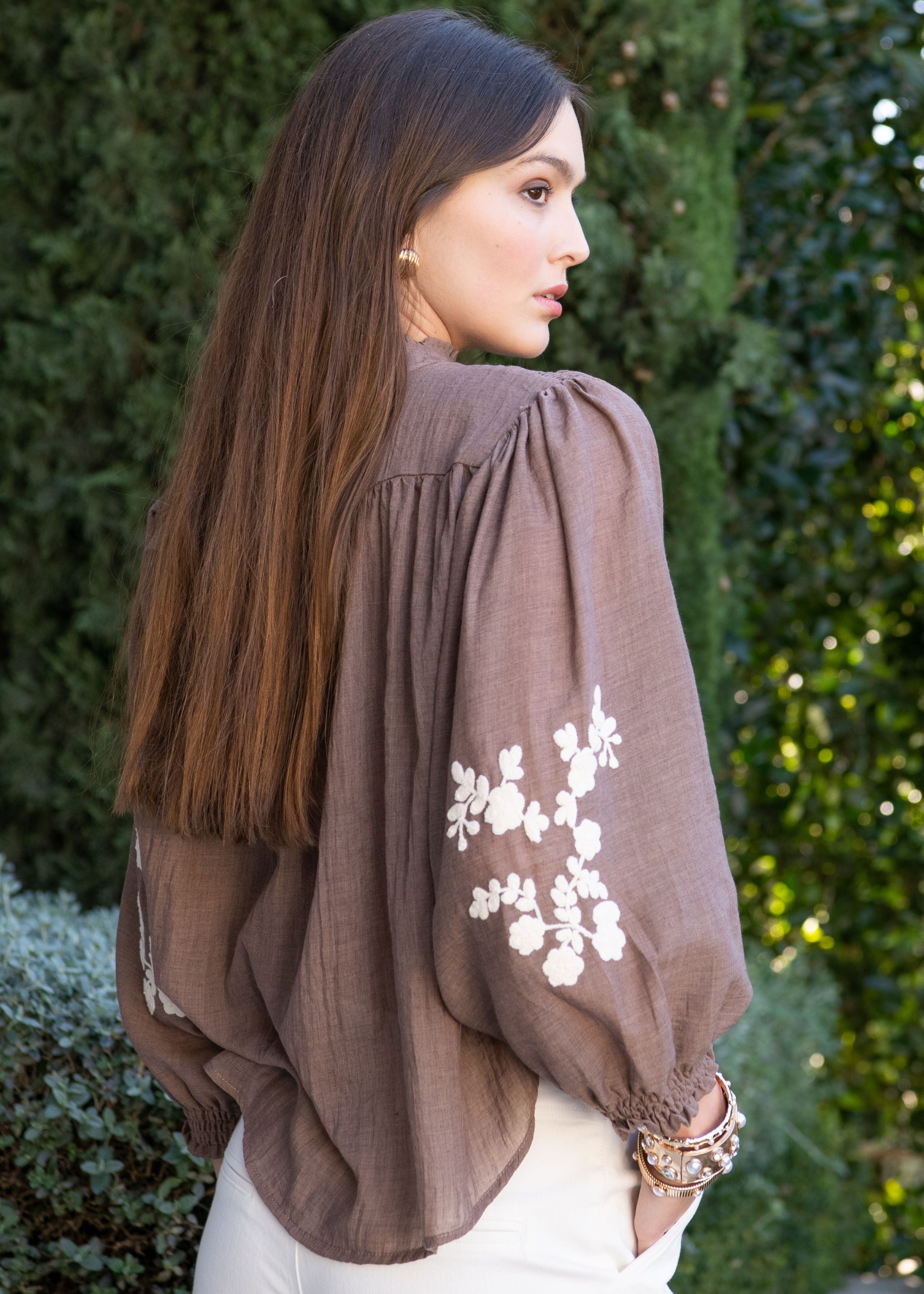 Marjorie Mock Neck Long sleeve Top with Embroidery - Brown