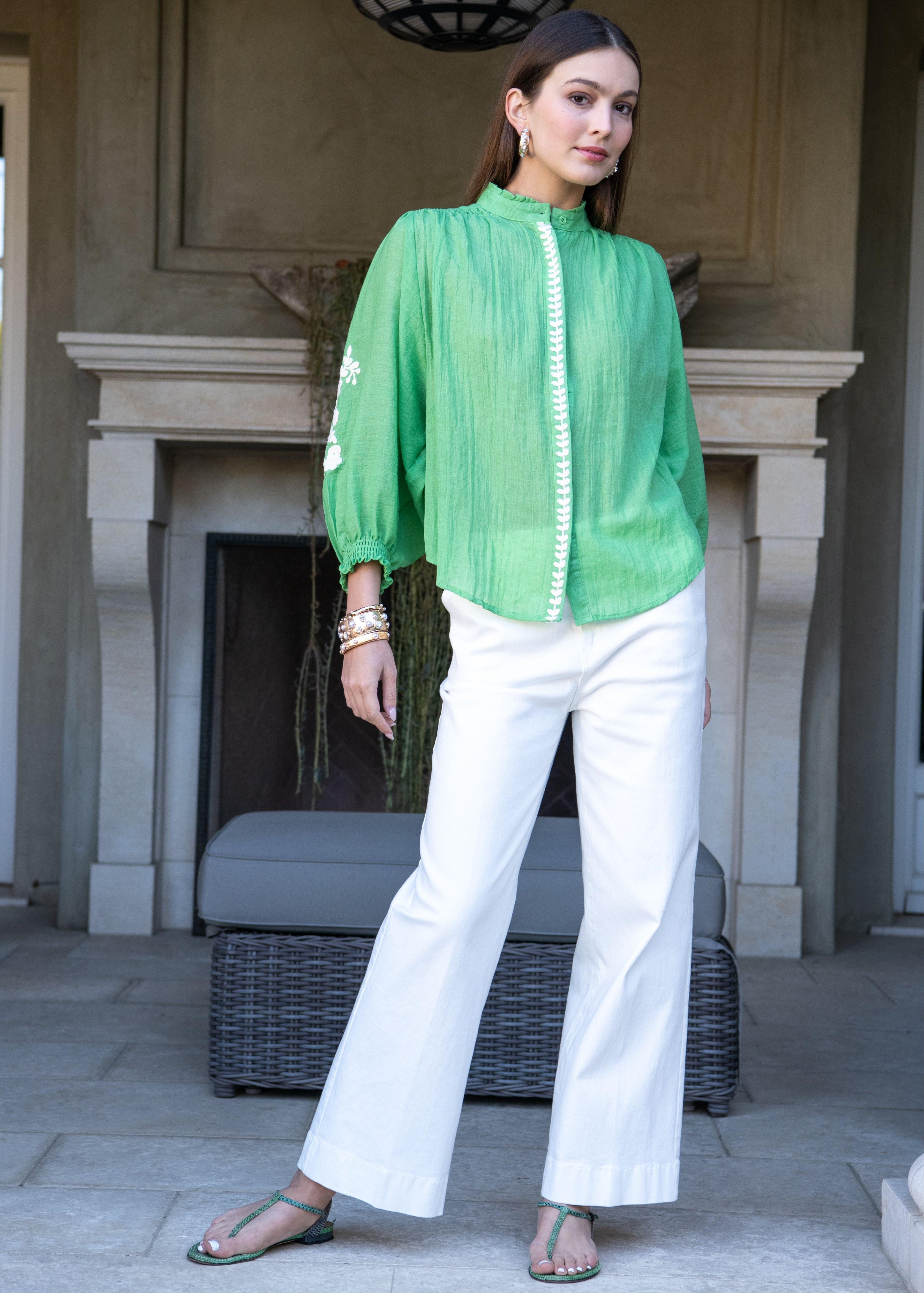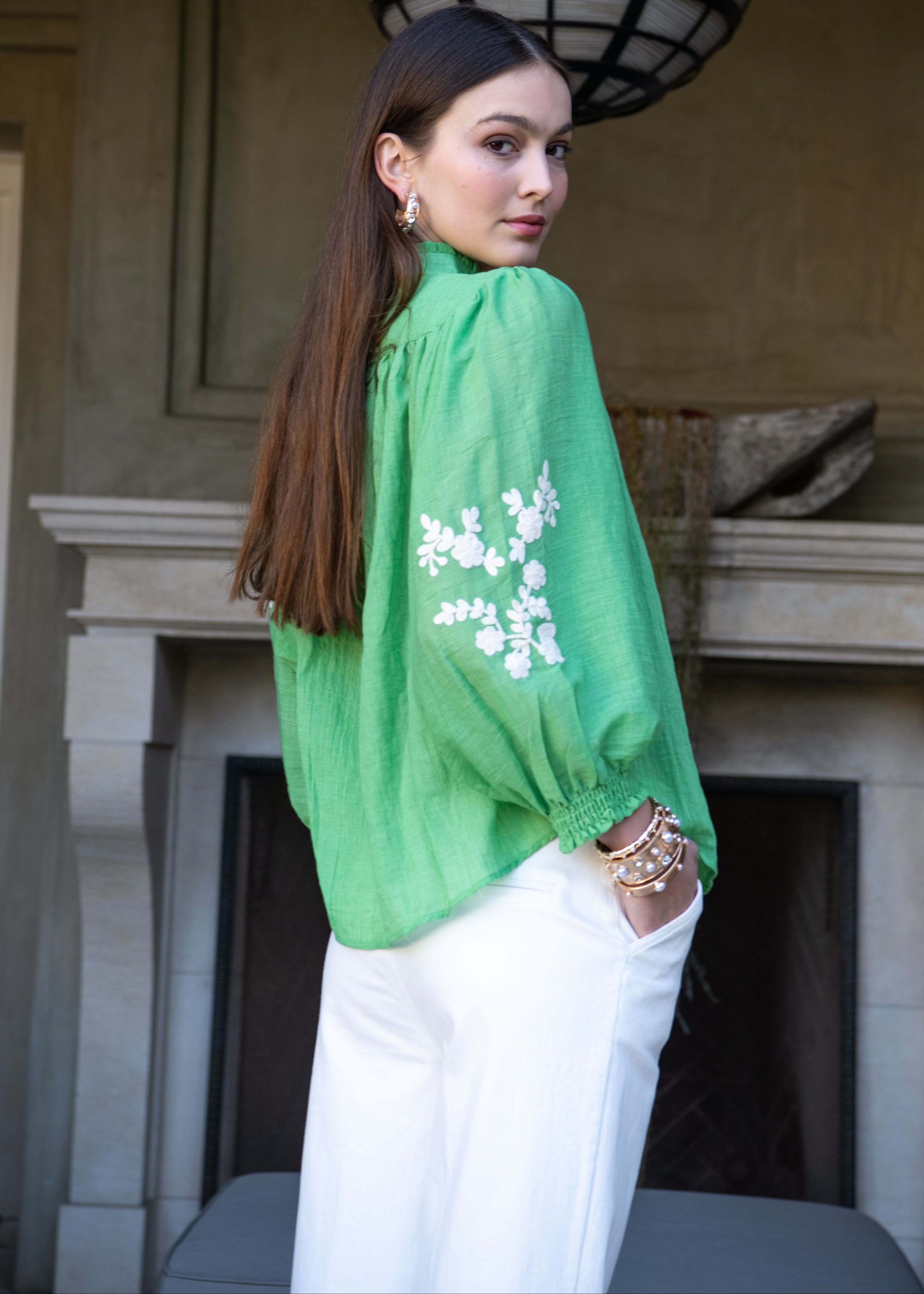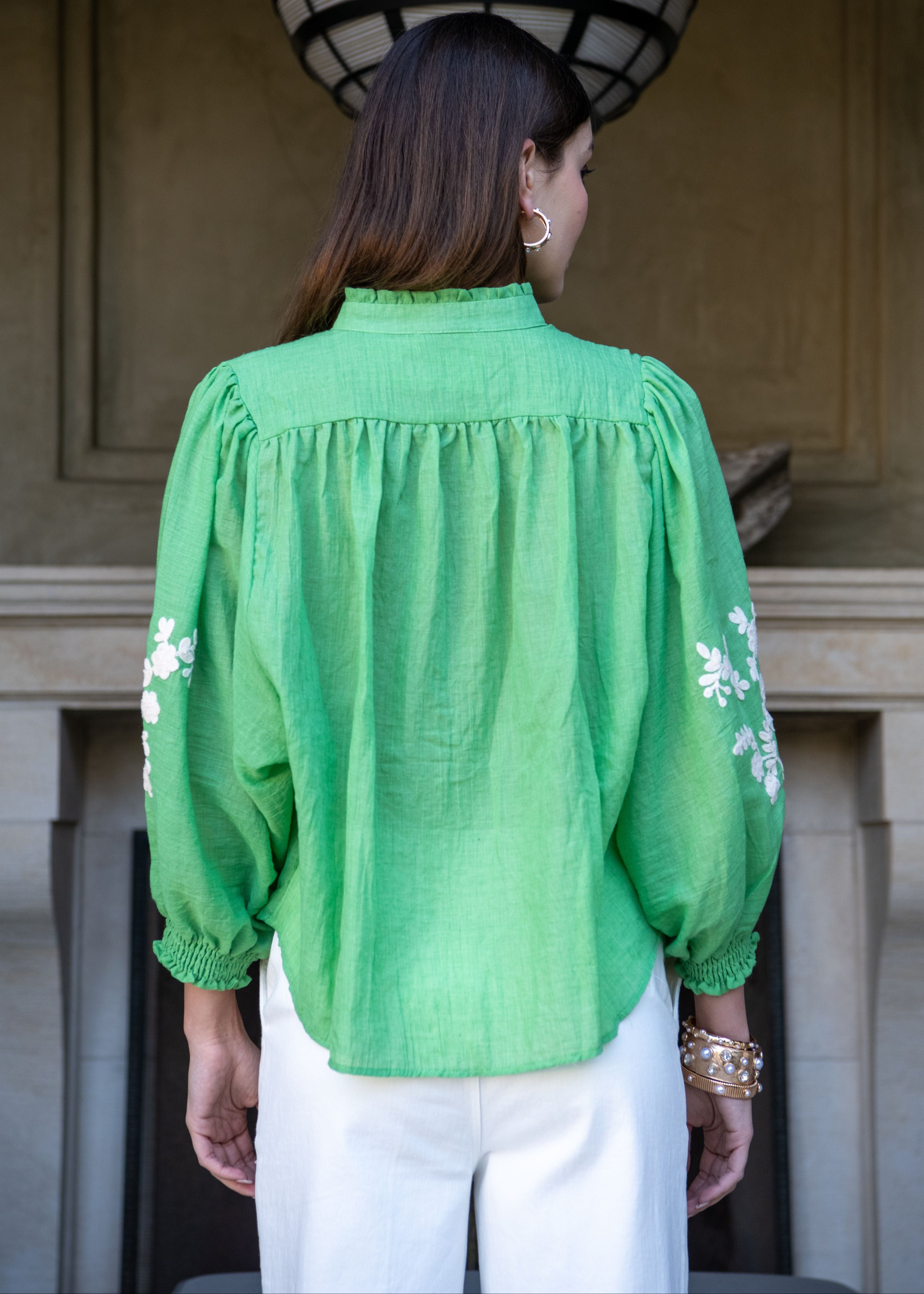 Marjorie Mock Neck Long sleeve Top with Embroidery - Green