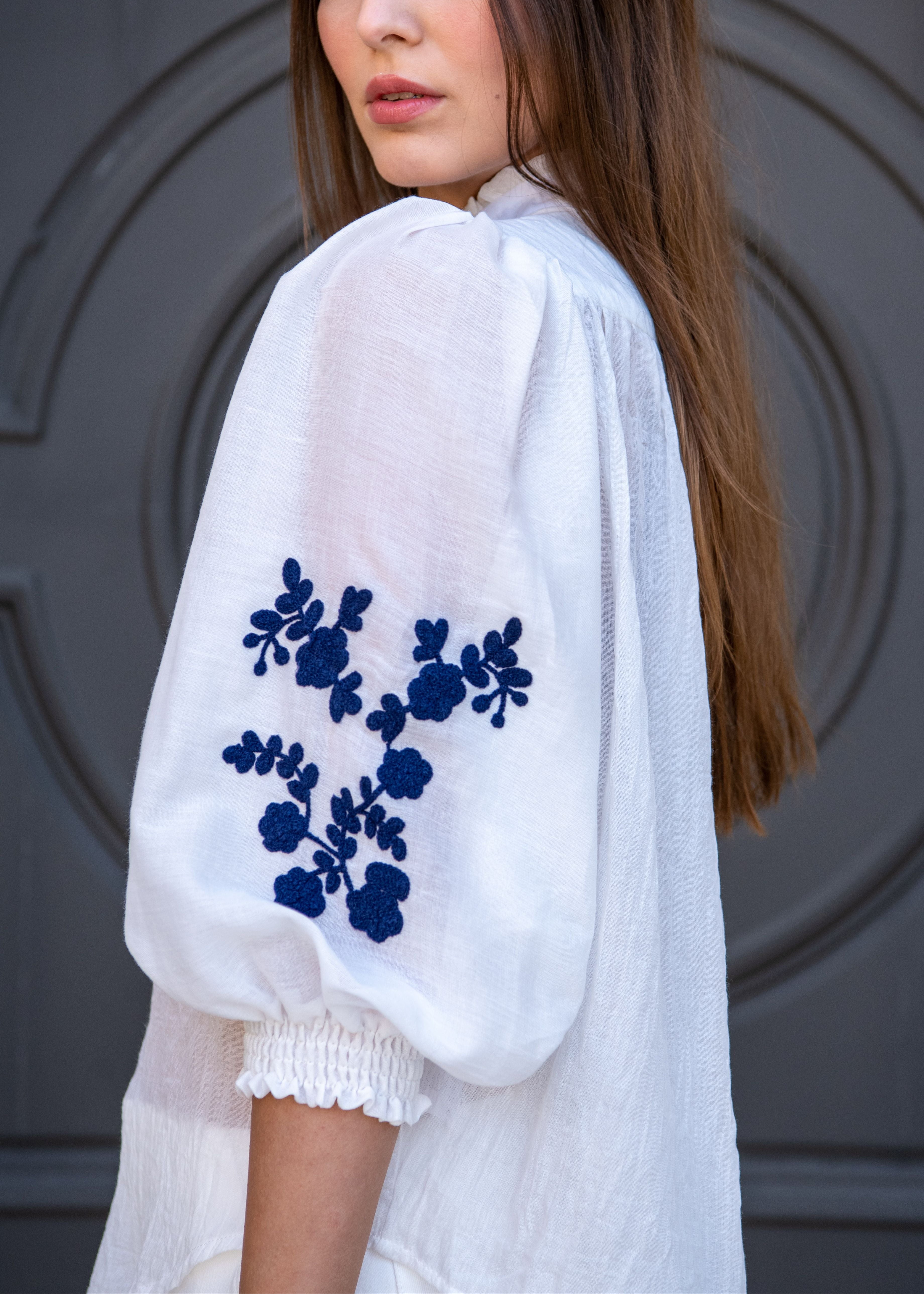 - Long puff sleeves with smocked wrists