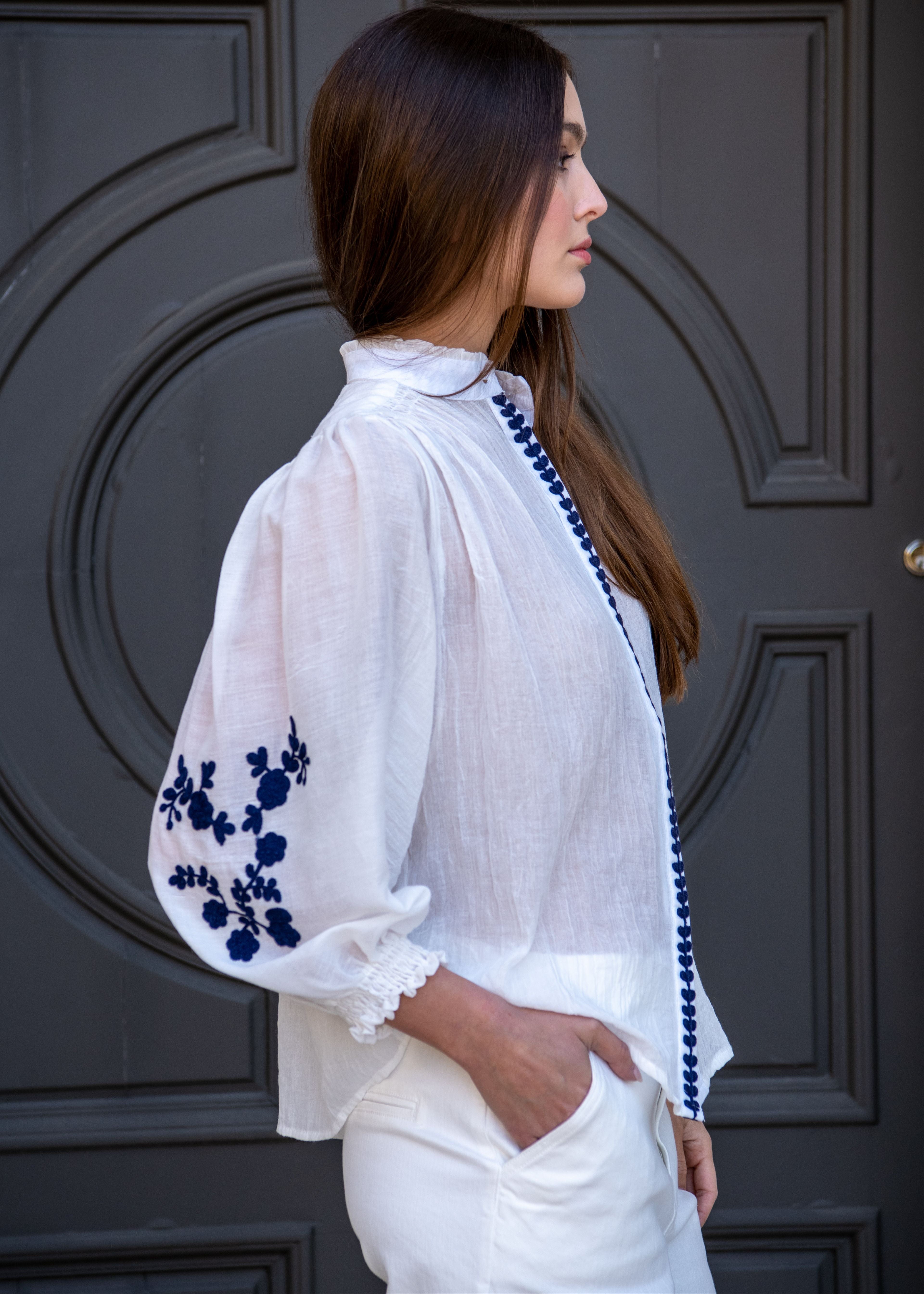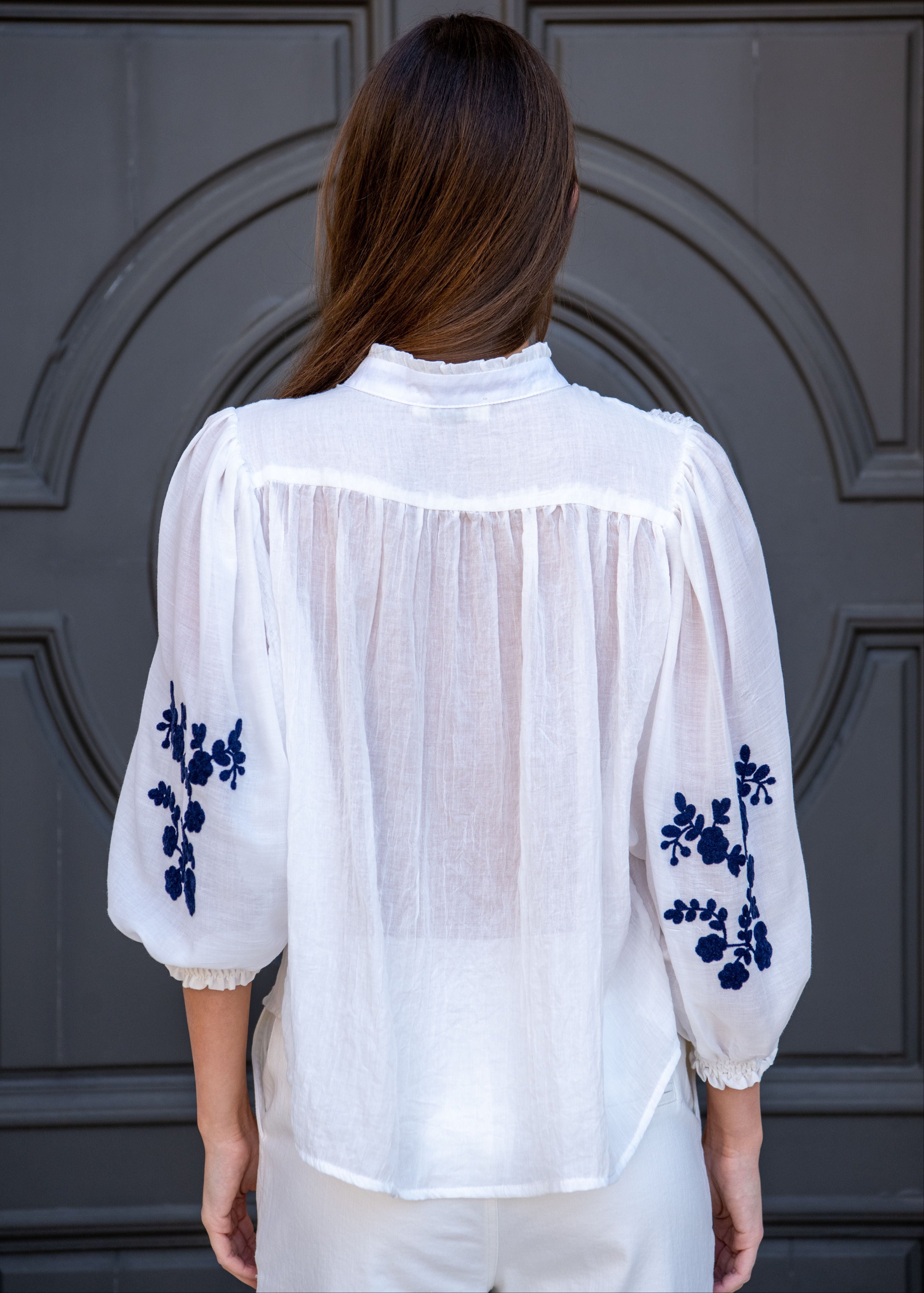 Marjorie Mock Neck Long sleeve Top with Embroidery - White