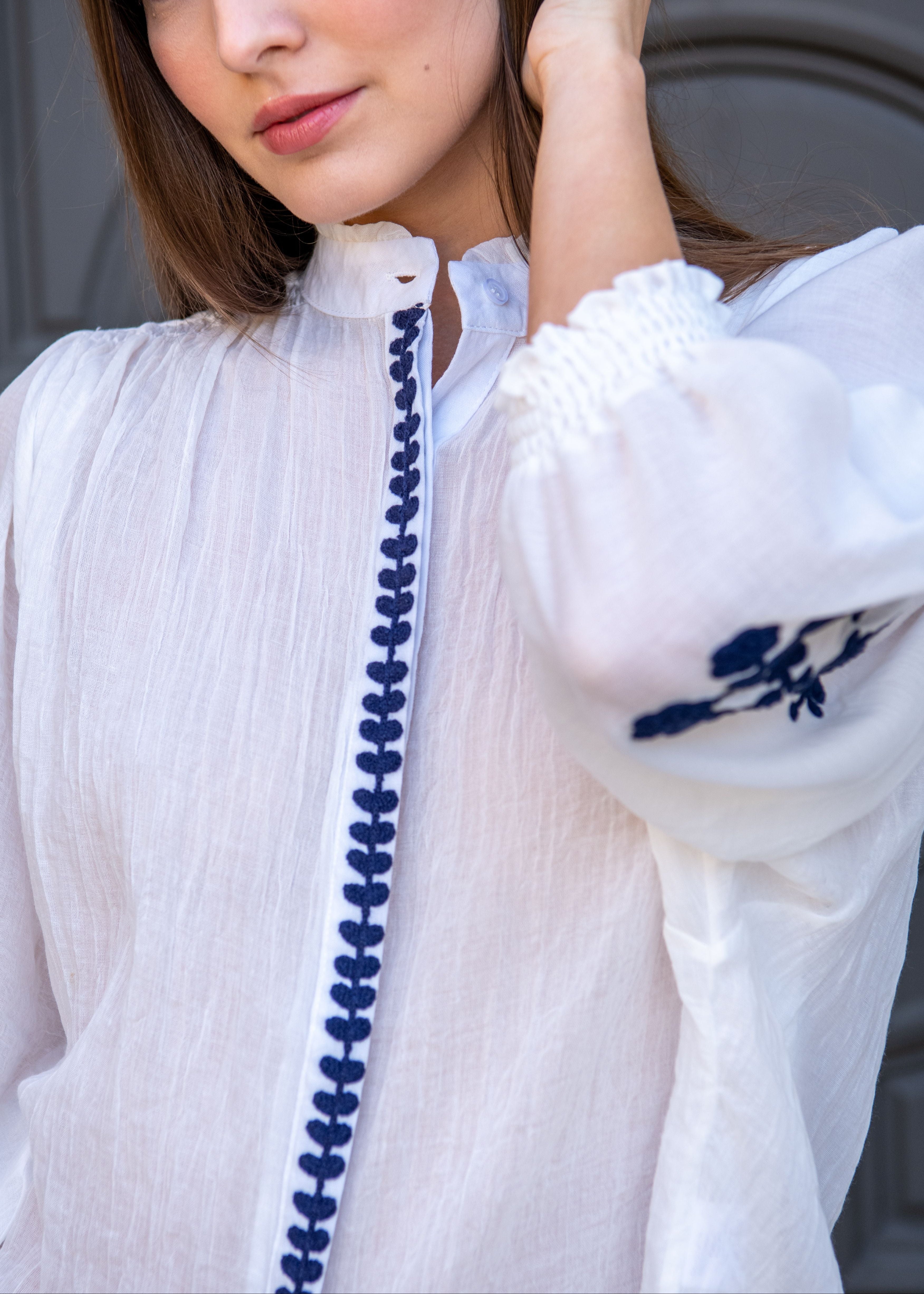 - Button down front, Embroidery details