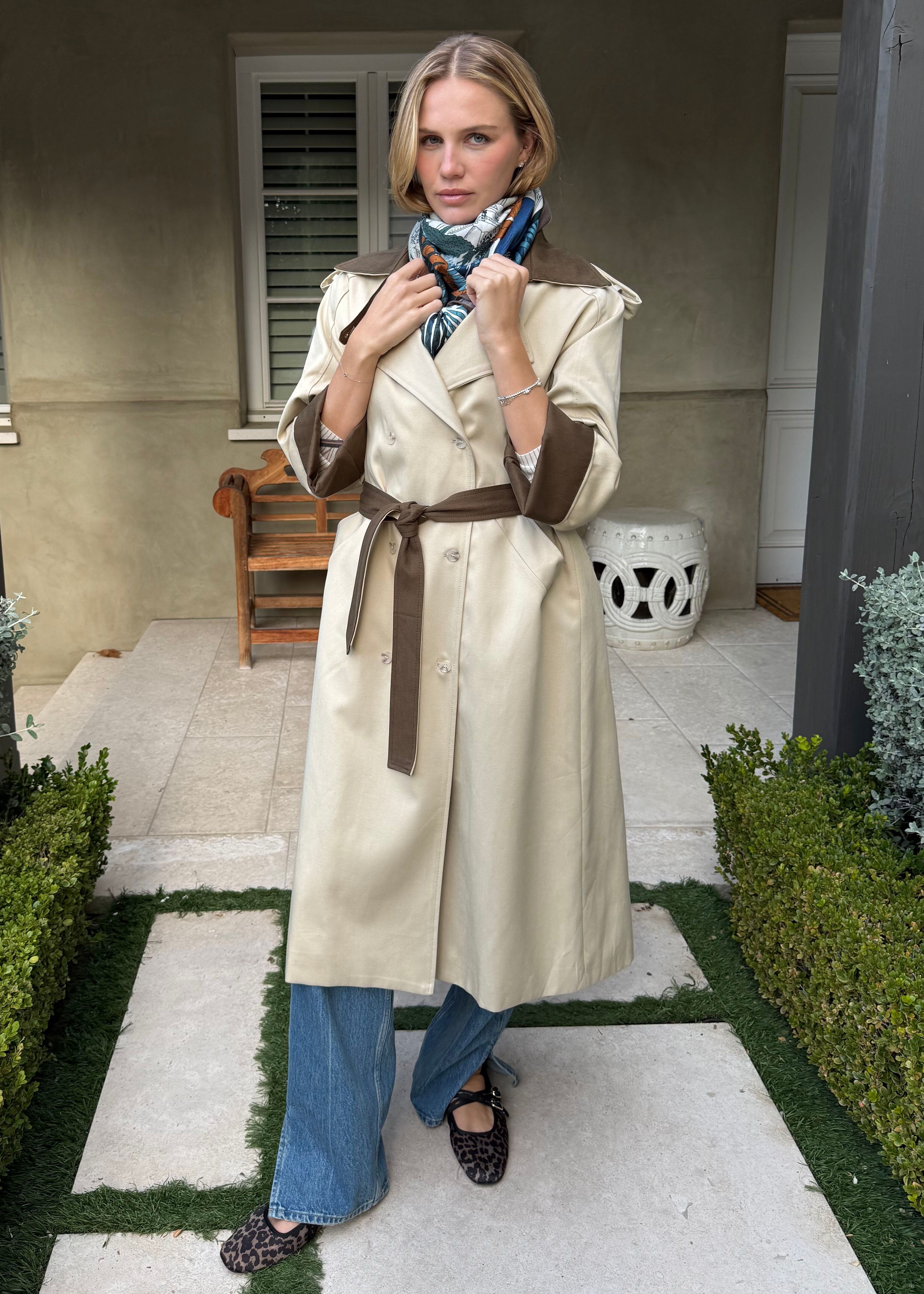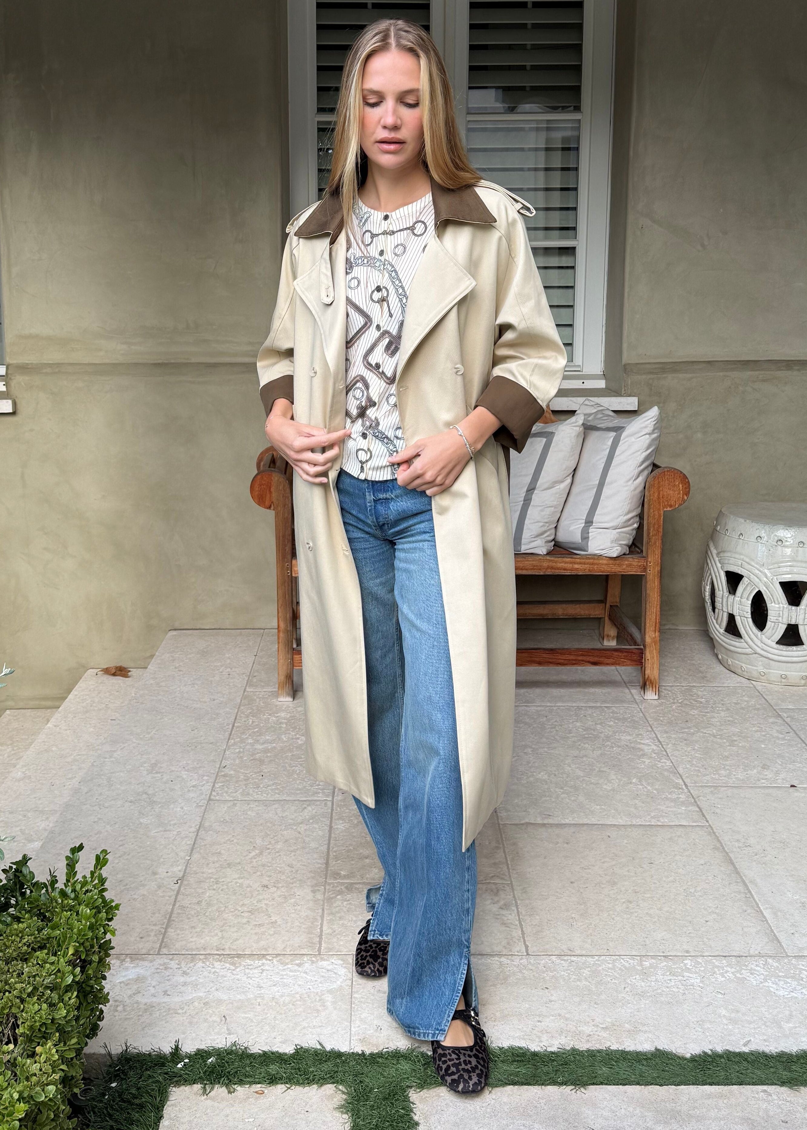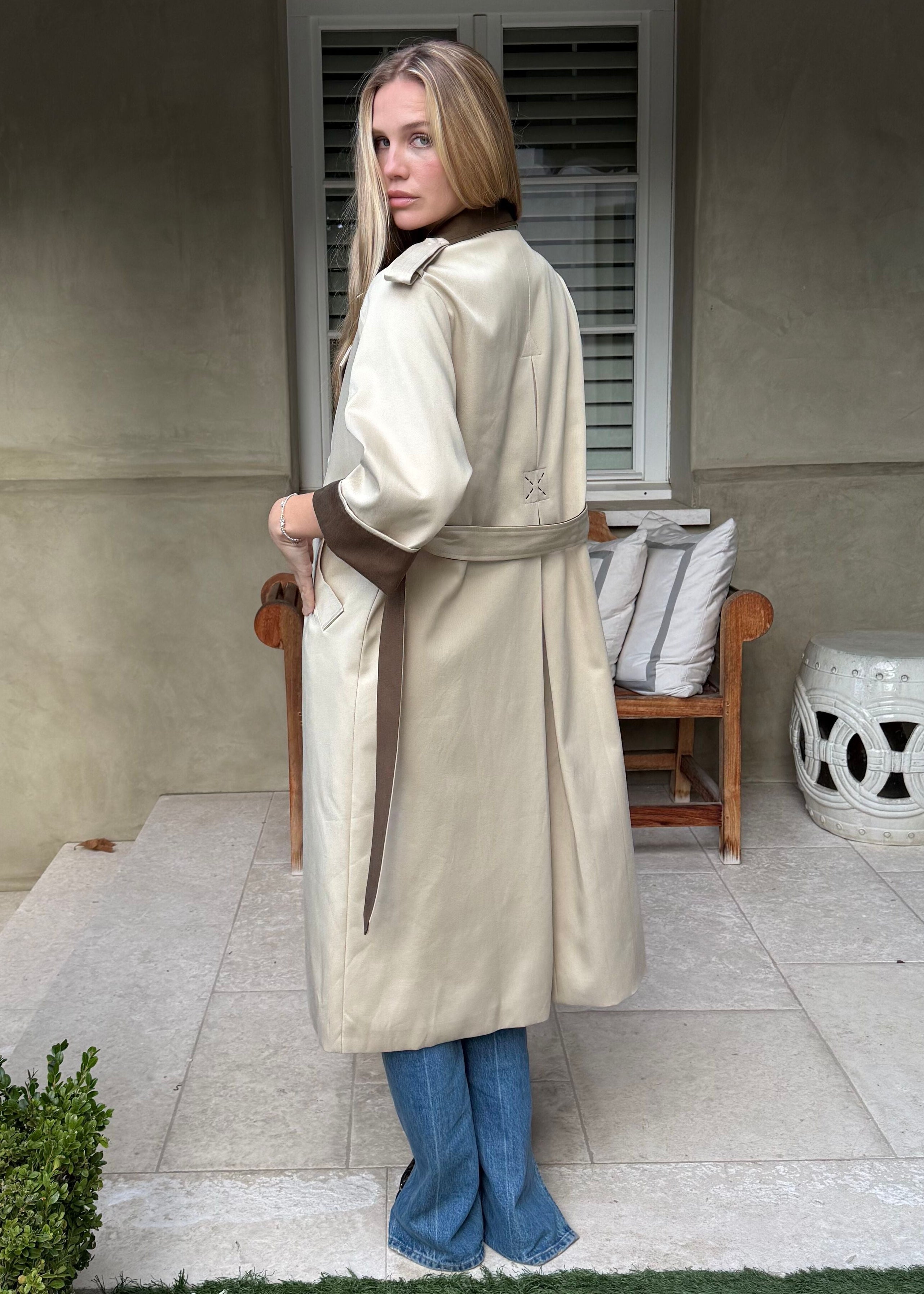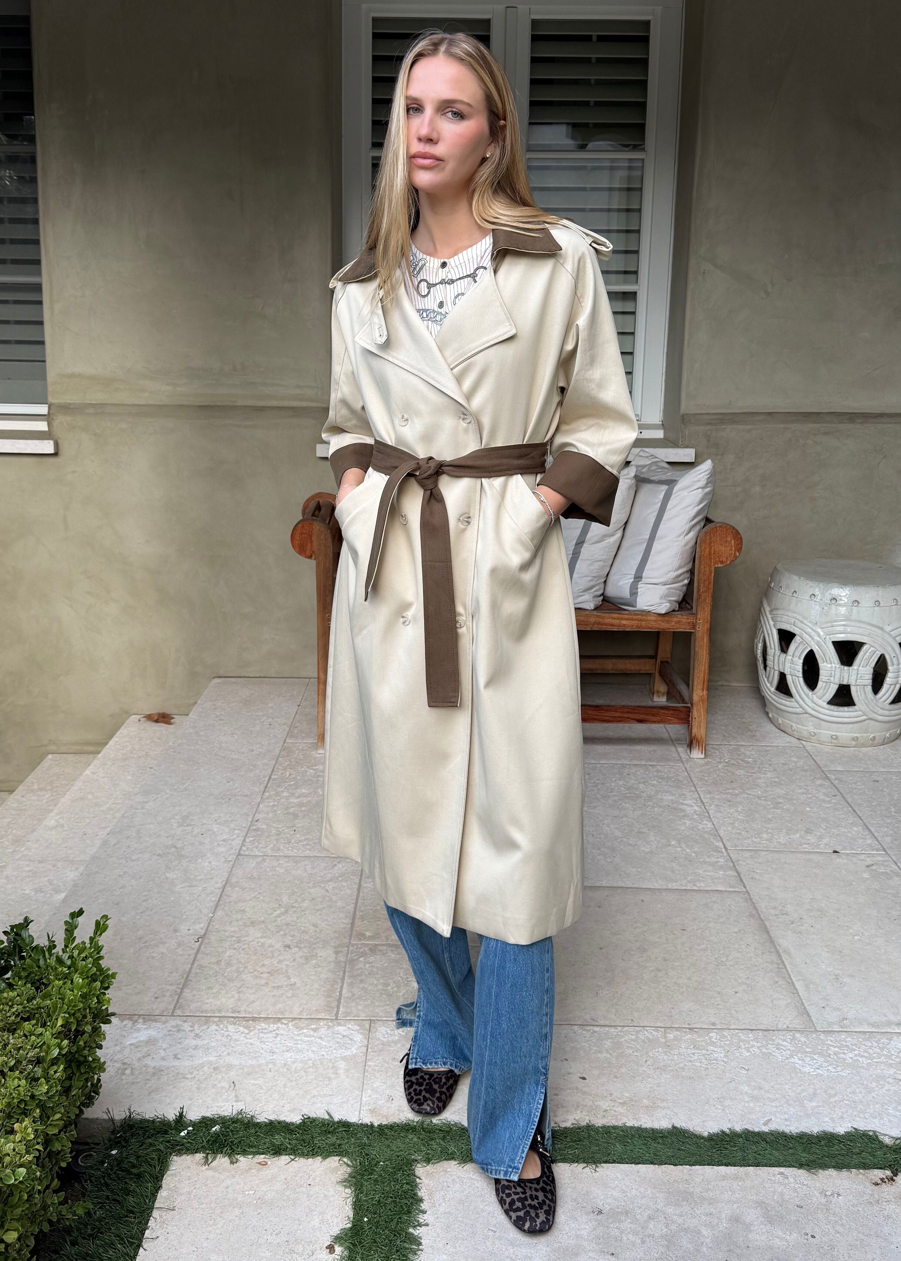 Slip into this sandy cream trench and get ready to feel like the main character. The structured belt cinches your silhouette while chocolate brown accents keep things interesting. Whether you're running errands or heading somewhere fabulous, this coat is your ticket to looking effortlessly chic.