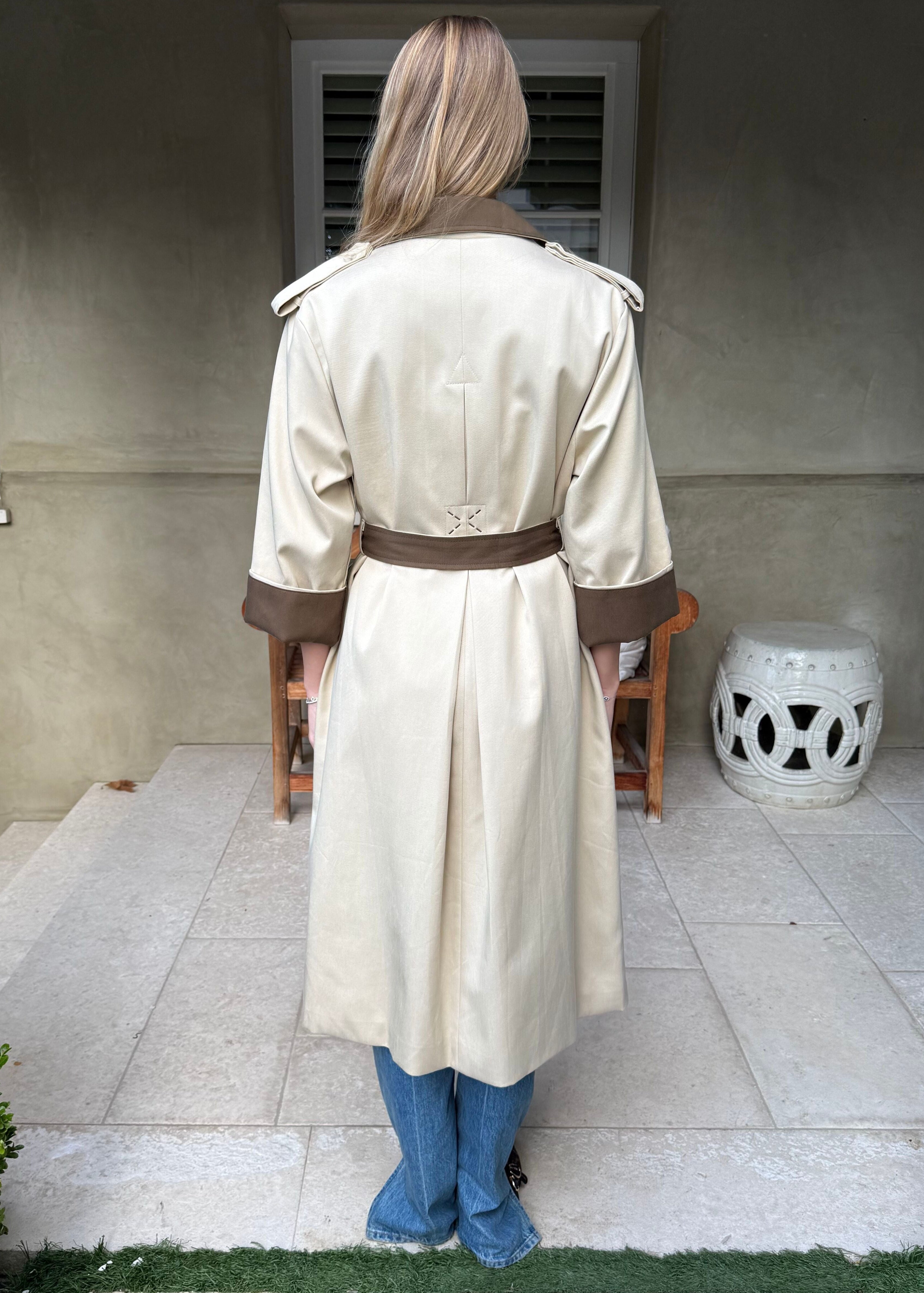 Sandy Cream Belted Trench Coat with Brown Contrast