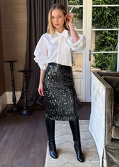 The Sasha Sequin Back Slit Pencil Midi Skirt combines dazzling sparkle with timeless elegance. Its form-fitting silhouette flatters every curve, while luminous sequins catch the light with every movement. The graceful back slit adds sophistication and ease, making this midi skirt an ideal choice for evening events and memorable nights out.