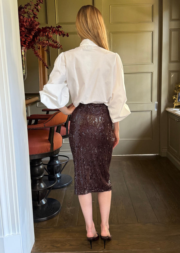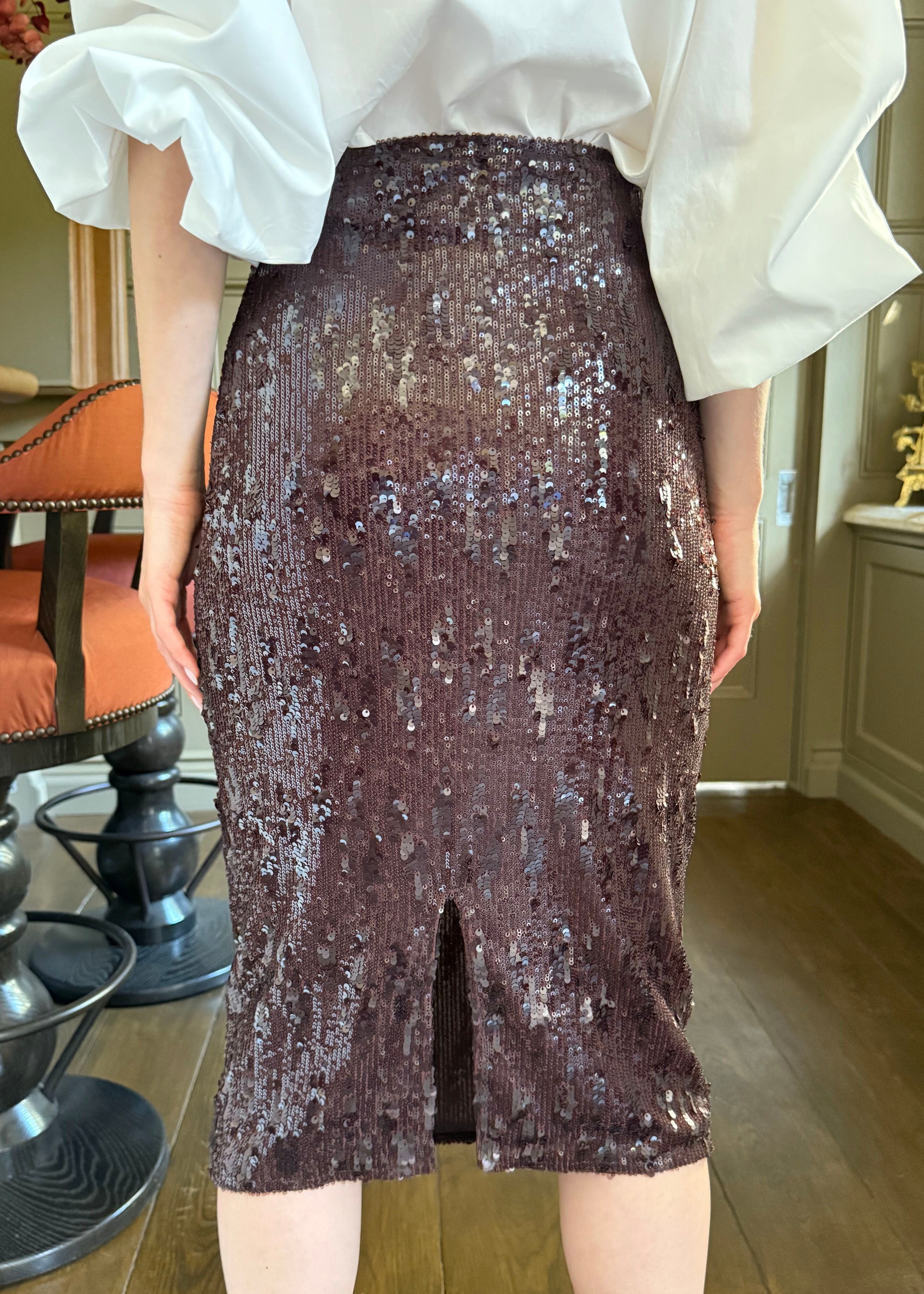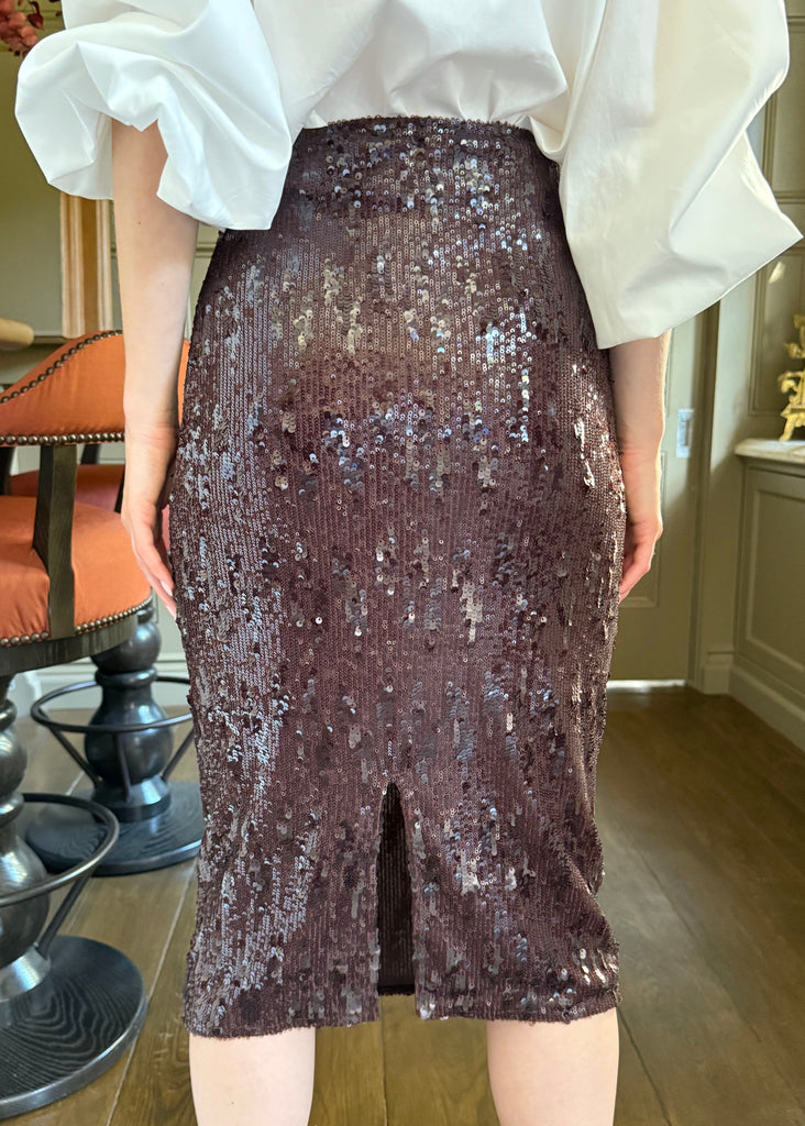 Sasha Sequin Back Slit Pencil Midi Skirt - Chocolate Brown