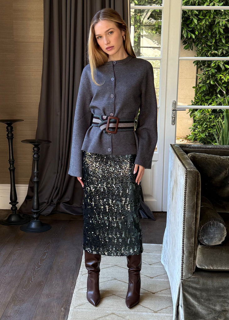 The Sasha Sequin Back Slit Pencil Midi Skirt combines dazzling sparkle with timeless elegance. Its form-fitting silhouette flatters every curve, while luminous sequins catch the light with every movement. The graceful back slit adds sophistication and ease, making this midi skirt an ideal choice for evening events and memorable nights out.