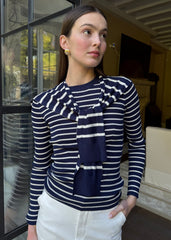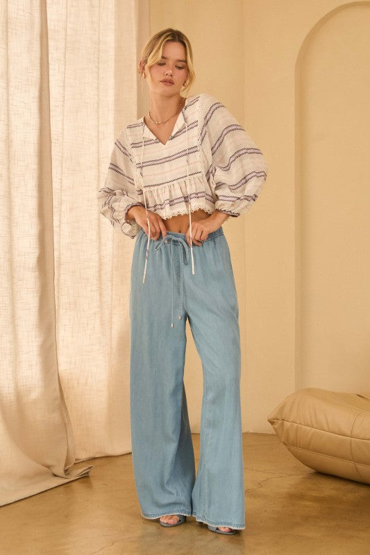 Charming striped peasant top with a cropped peplum silhouette, V-neck tie details, and flowing long sleeves. Elastic wrist cuffs and delicate lace trim complete this romantic, effortless piece.