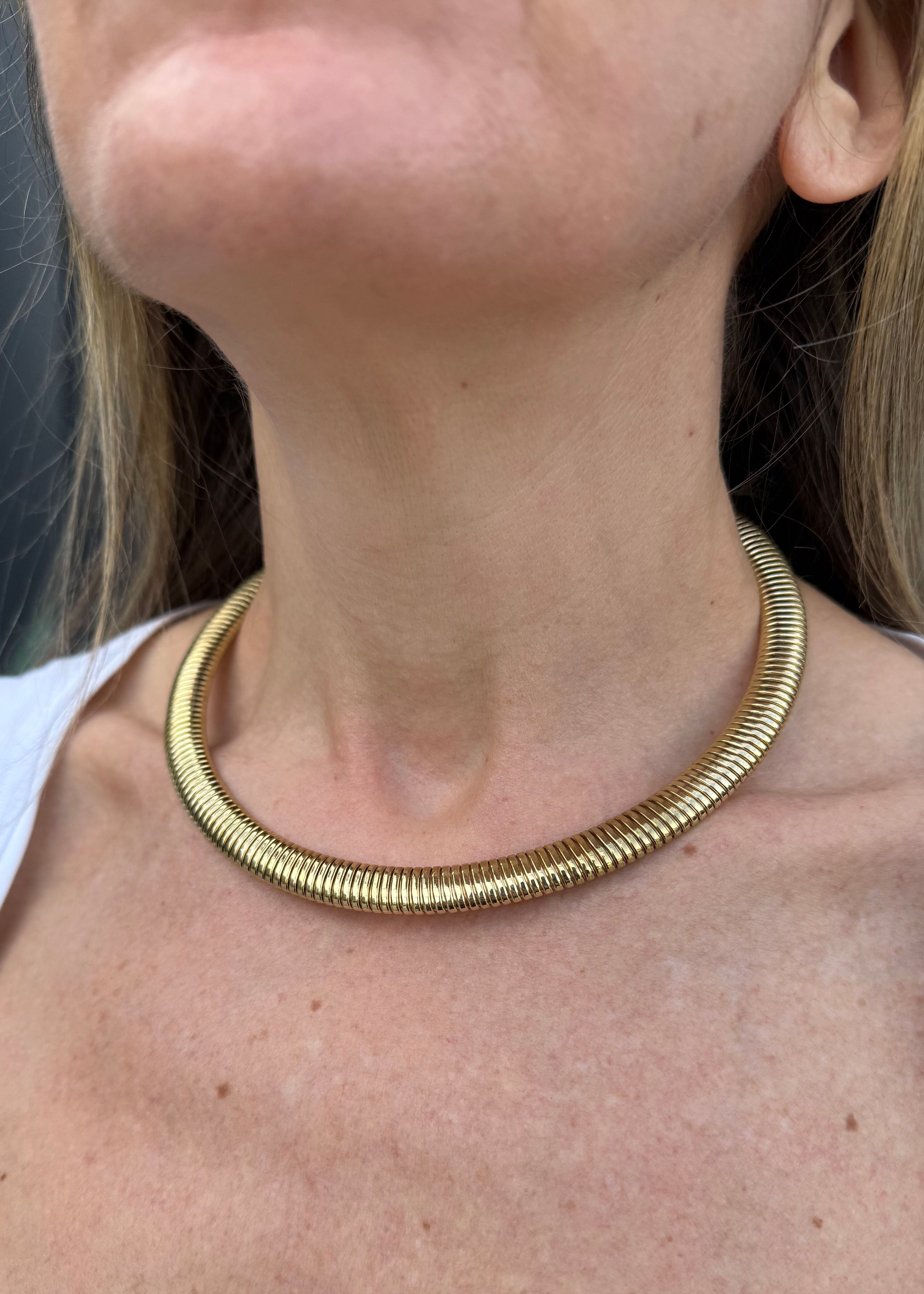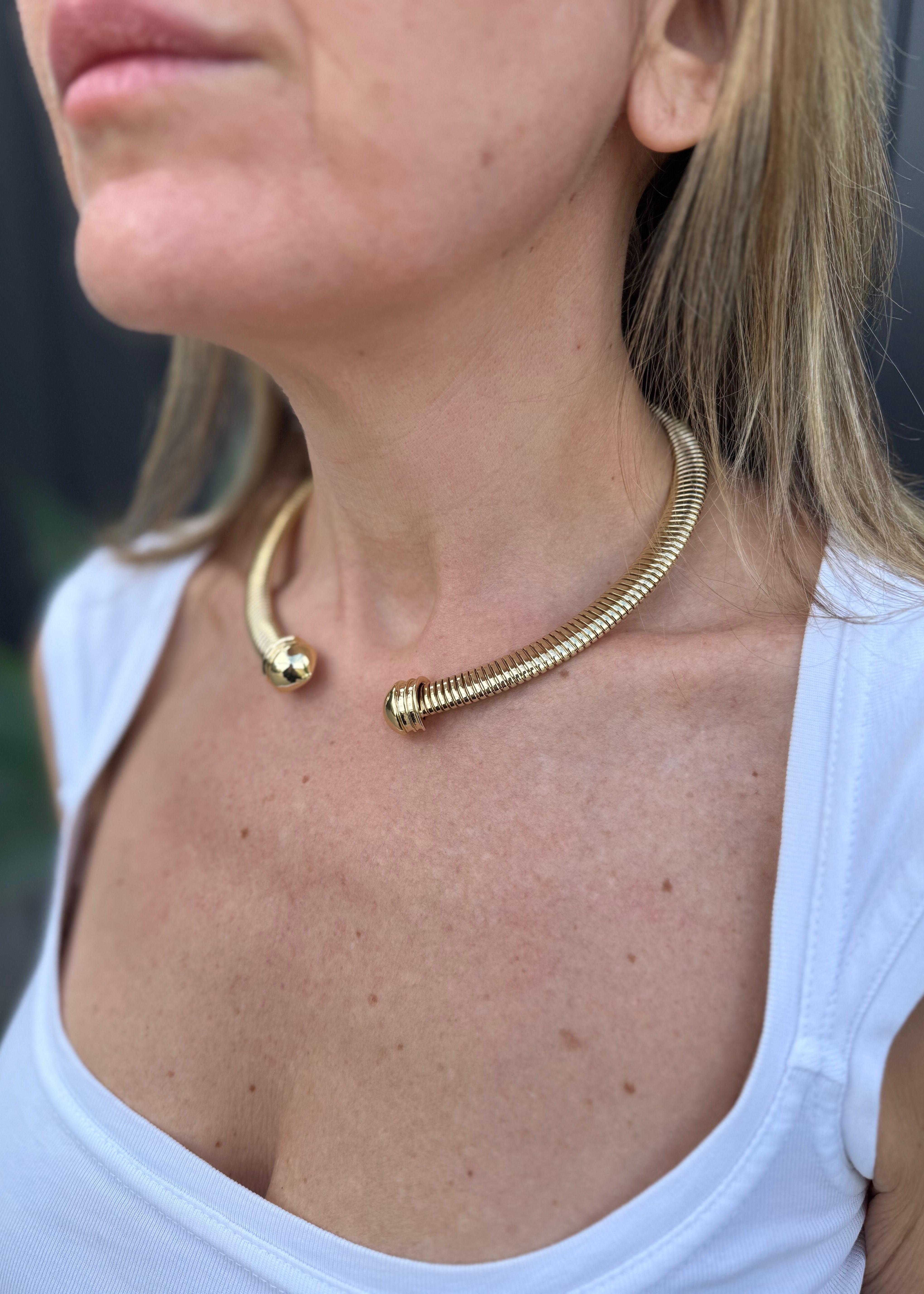 Delicate ribbed detailing meets timeless gold in this skinny collar necklace that hugs your neck just right. Perfect for layering or wearing solo, it's the effortless accessory that makes every outfit feel a little more polished and a whole lot more fun.