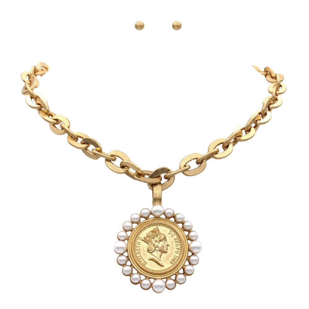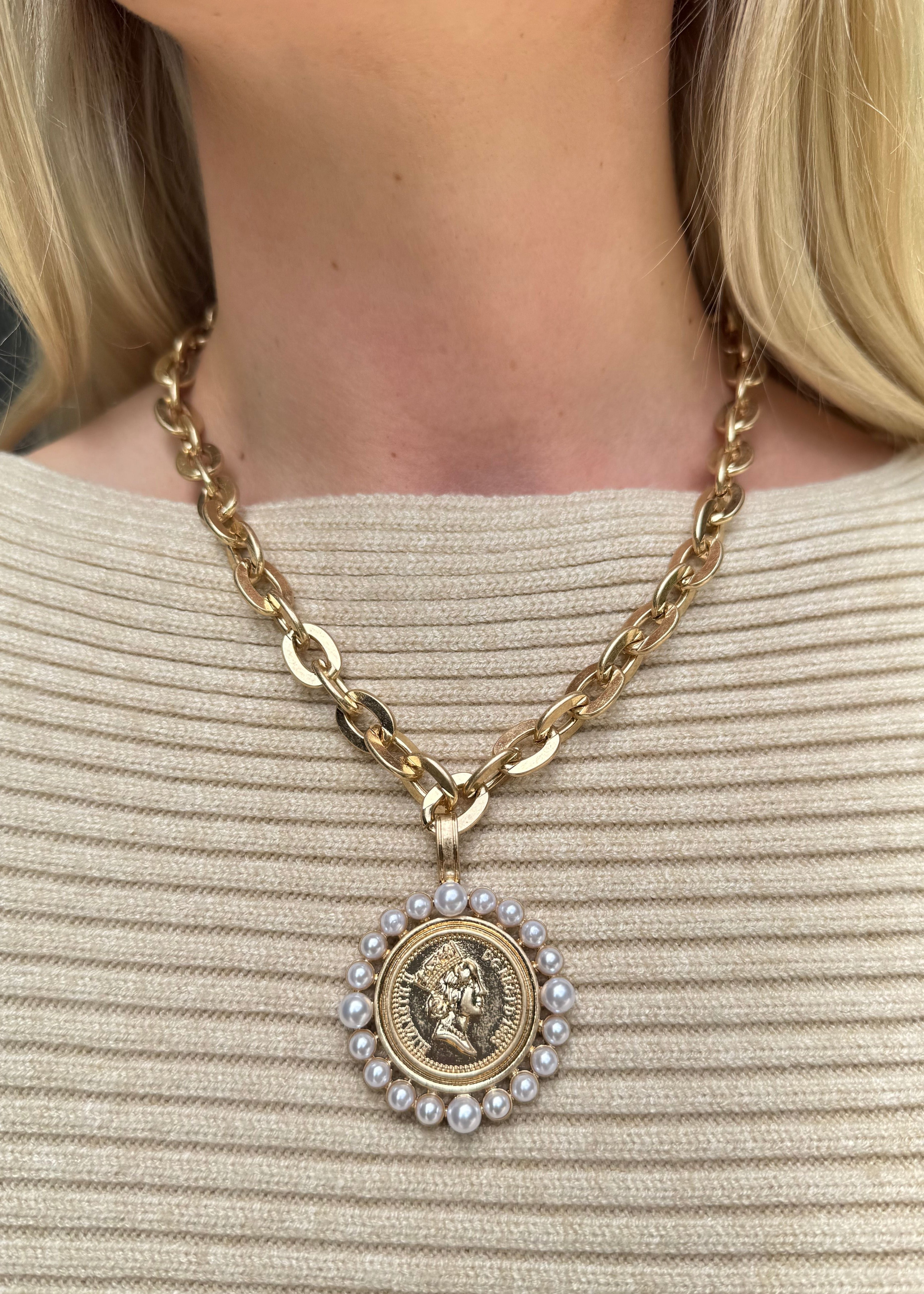 Elevate your elegance with the Stuart Pearl Beaded Medallion Pendant Necklace. Featuring a flat oval link chain adorned with lustrous pearls, this sophisticated piece offers timeless charm and refined style for any occasion.
