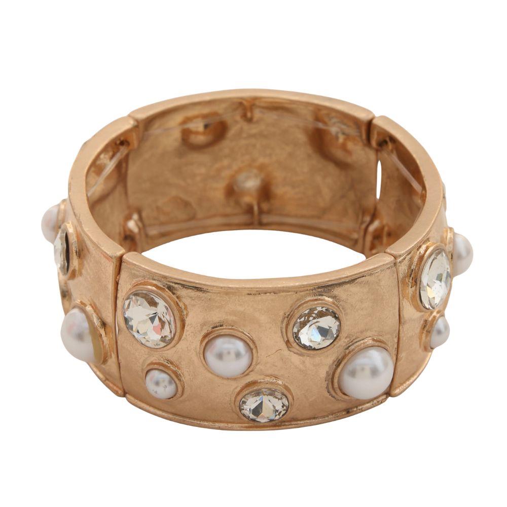 Tyler Wide Hammered Gold Bracelet - Pearl and Rhinestone
