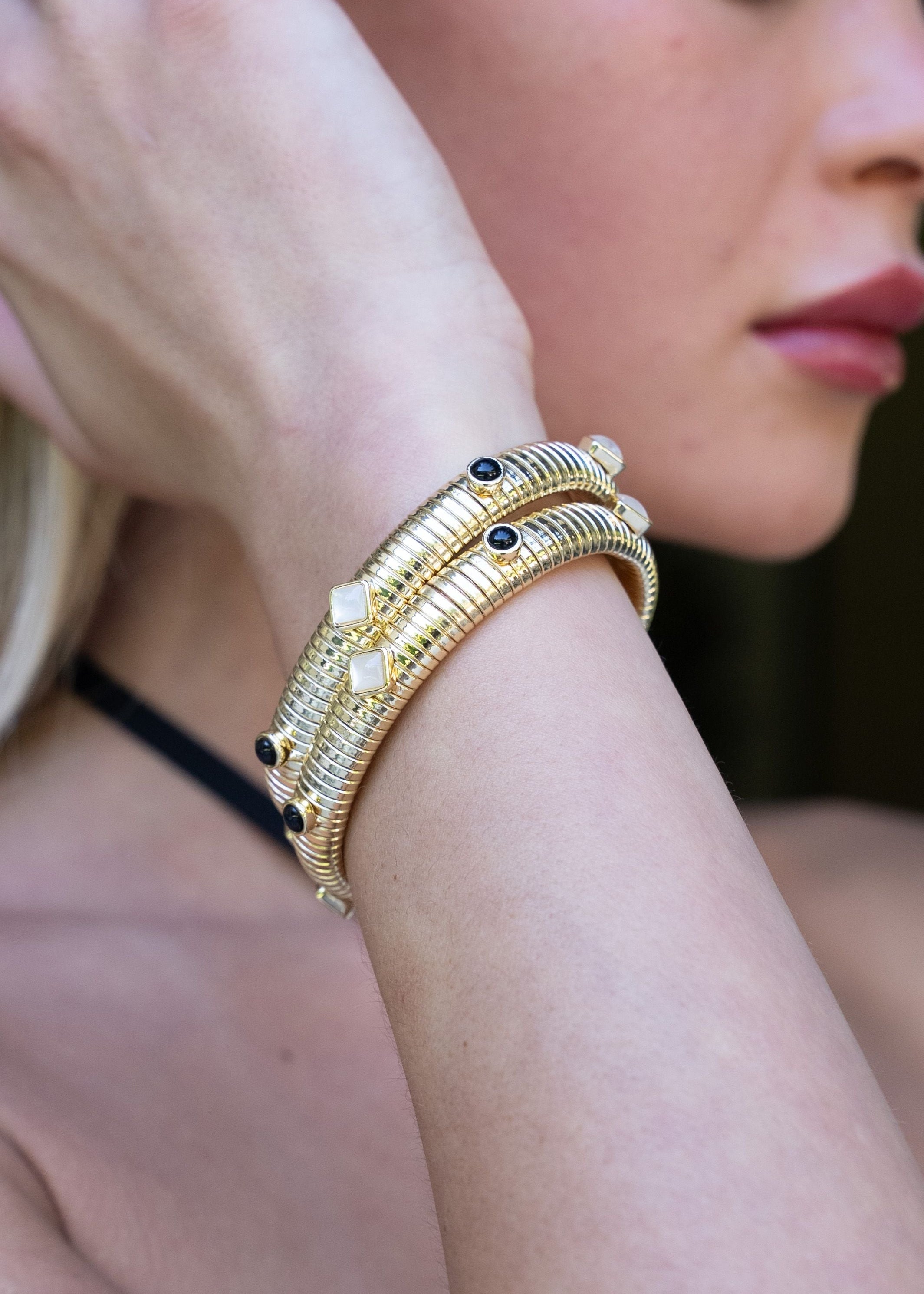 Slip on sophistication with this stunning ribbed bangle that catches the light just right. The detailed stone work paired with gleaming gold metal creates an effortlessly chic accessory that works solo or stacked with your favorites. Pure wrist magic.